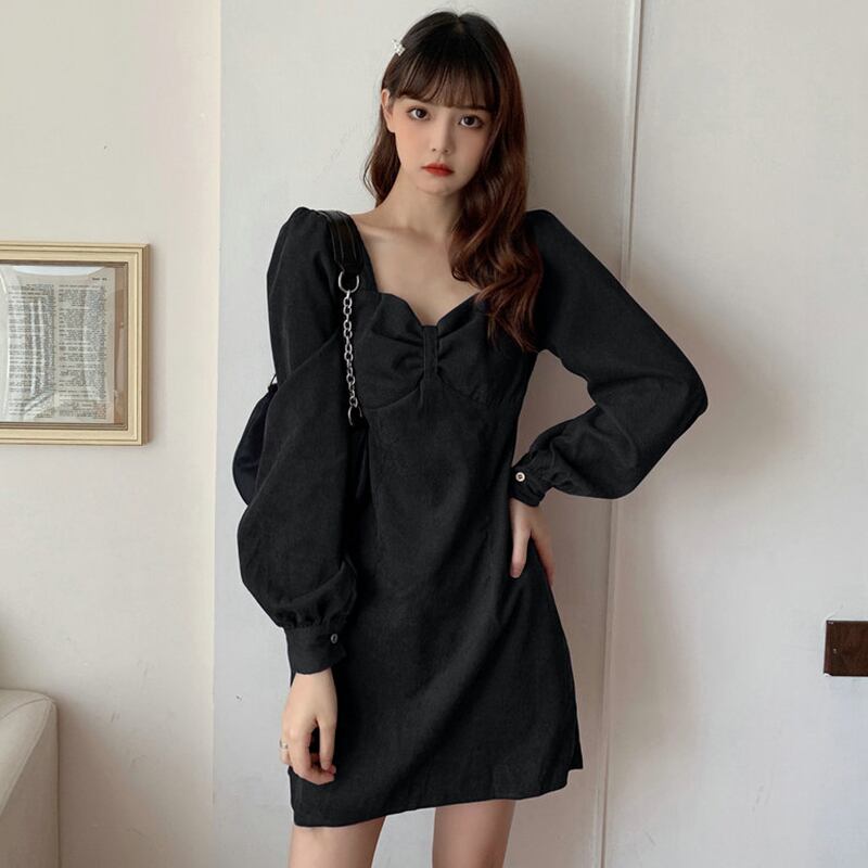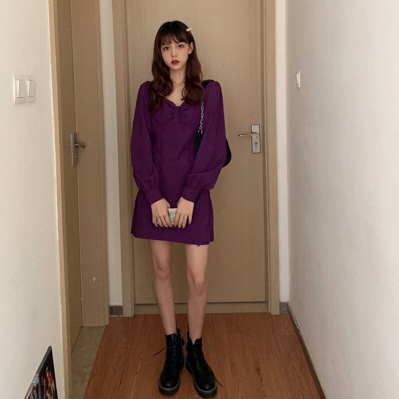 リボン結び風 ミニ丈 ワンピース ミニ 膝上 袖あり 長袖 パフスリーブ Vネック スクエアネック 襟なし Aライン リボン 綿 ウール かわいい 大人可愛い シンプル カジュアル 大人 おしゃれ お洒落 大人女子 ガーリー 無地 春 秋 10代 20代 レディース 学生 通学 デート お出かけ 女子会 休日 旅行 着回し 普段使い 韓国 韓国系 オルチャン 大きいサイズ M L XL 2XL 3XL 4XL 色展開 黒 ブラック 紫 パープル