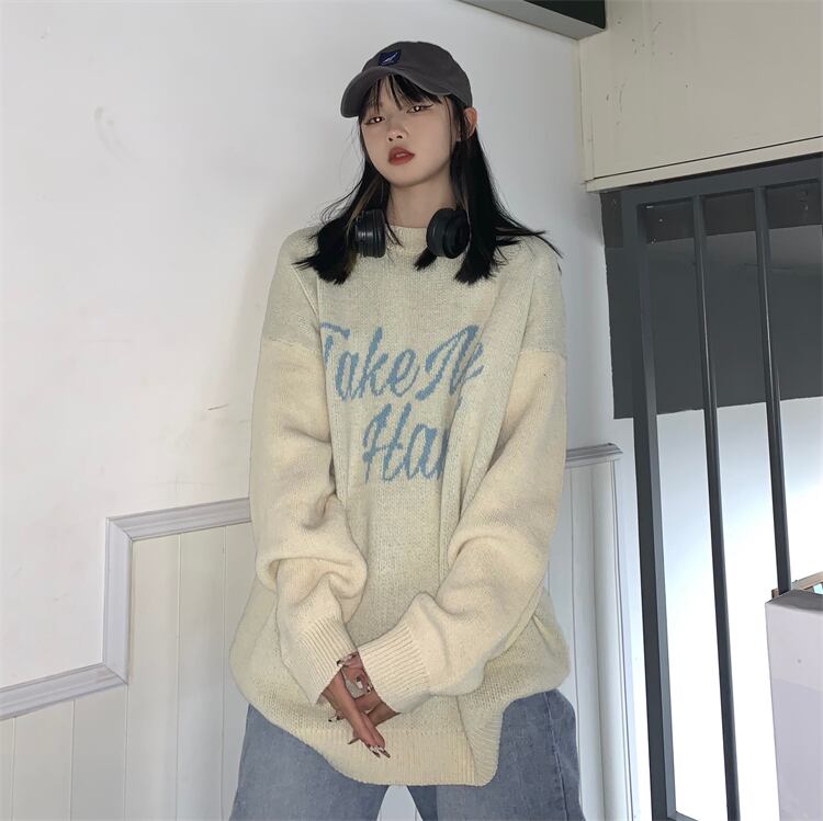 英字 ラウンドネック ニットセーター トップス セーター ミディアム丈 袖あり 長袖 ドロップショルダー 萌袖 襟なし かわいい カジュアル おしゃれ お洒落 こなれ感 ボーイッシュ ルーズ ロゴ 春 秋 10代 20代 レディース 通勤 学生 通学 デート お出かけ 女子会 休日 旅行 着回し 普段使い 重ね着 韓国 韓国系 オルチャン ファッション ゆったり ゆる フリーサイズ 大きめ 色展開 茶色 ブラウン オフホワイト