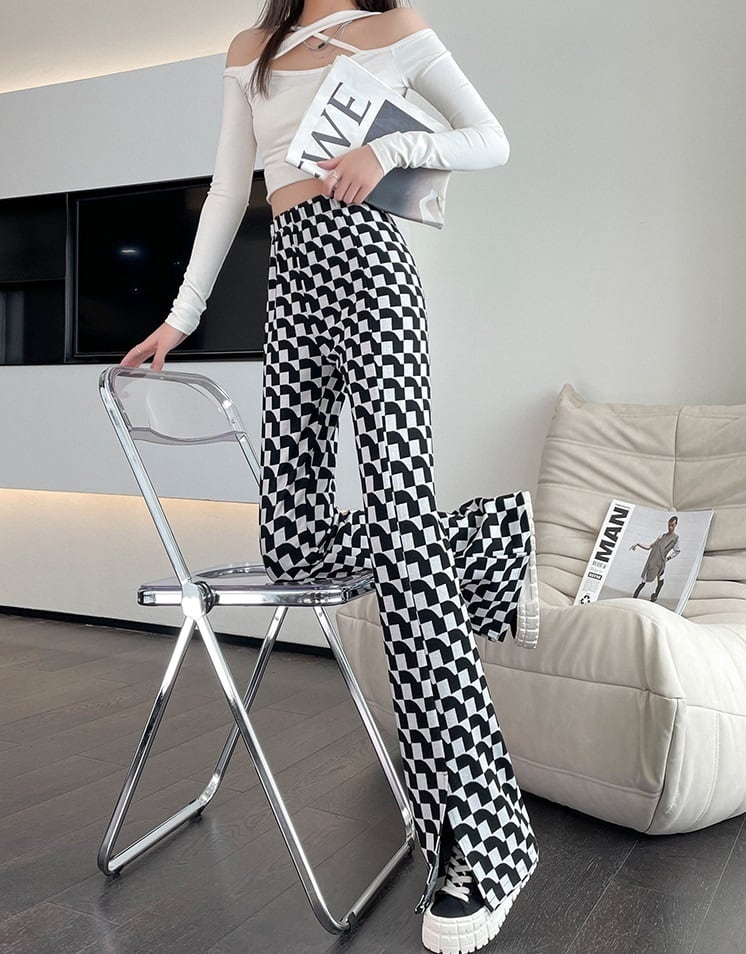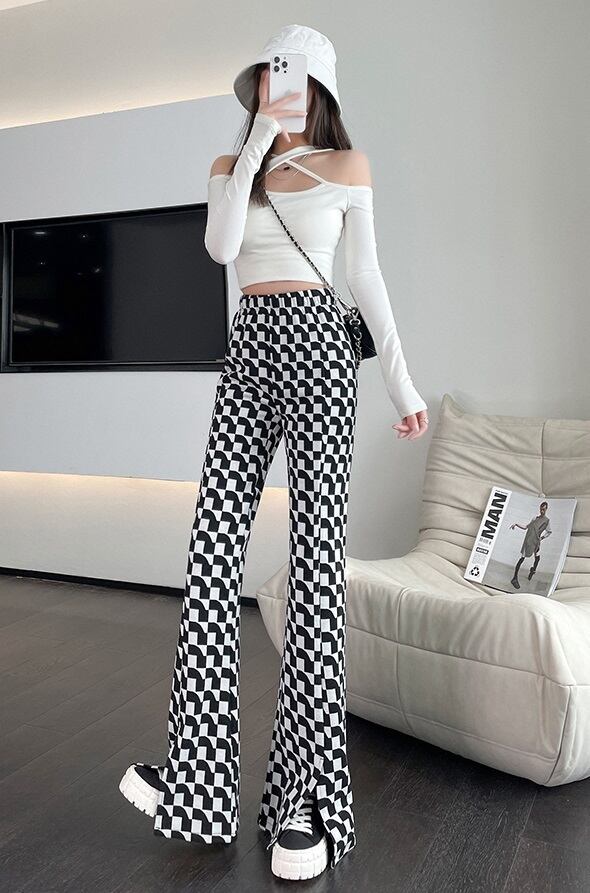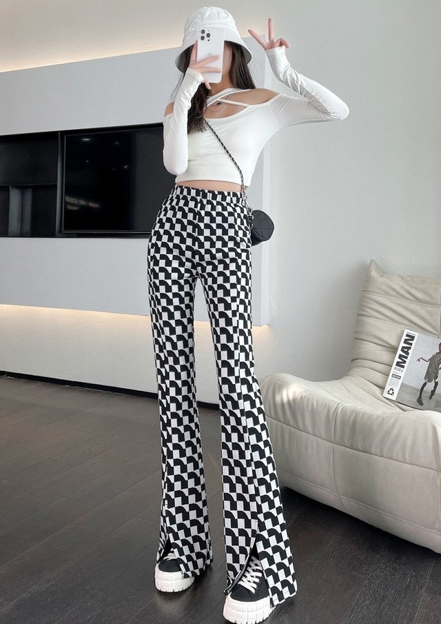 チェック柄 ハイウエスト フレアパンツ ボトムス パンツ ズボン ロング ロング丈 フレア スリム 細身 スリット ウエストゴム 伸縮性 かわいい 大人可愛い カジュアル 大人 おしゃれ お洒落 大人女子 こなれ感 個性的 モード系 主役級 存在感 柄 格子柄 春 夏 秋 10代 20代 レディース 通勤 学生 通学 デート お出かけ 女子会 休日 旅行 着回し 普段使い 韓国 韓国系 オルチャン 大きいサイズ S M L XL 2XL 色展開 白 ホワイト 黒 ブラック 緑 グリーン