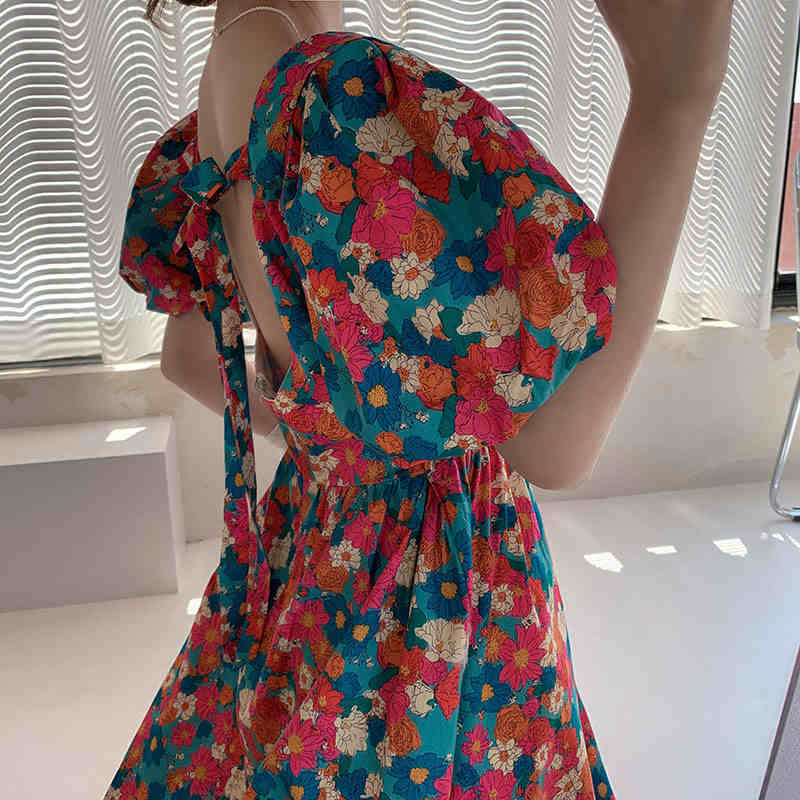 花柄 背中開き ワンピース 膝下 ミモレ ミモレ丈 袖あり 半袖 パフスリーブ スクエアネック 襟なし Aライン 切り替えデザイン リボン バックリボン バックシャン バックコンシャス ハイウエスト かわいい 大人可愛い カジュアル 大人 おしゃれ お洒落 レトロ 大人女子 ガーリー 主役級 存在感 小花柄 フラワー 夏 10代 20代 レディース 通勤 学生 通学 デート お出かけ 女子会 休日 旅行 着回し 普段使い 韓国 韓国系 オルチャン サイズ M L XL 色展開 赤 レッド 青 ブルー