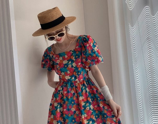レトロガーリーな総花柄のパフ袖ワンピース。