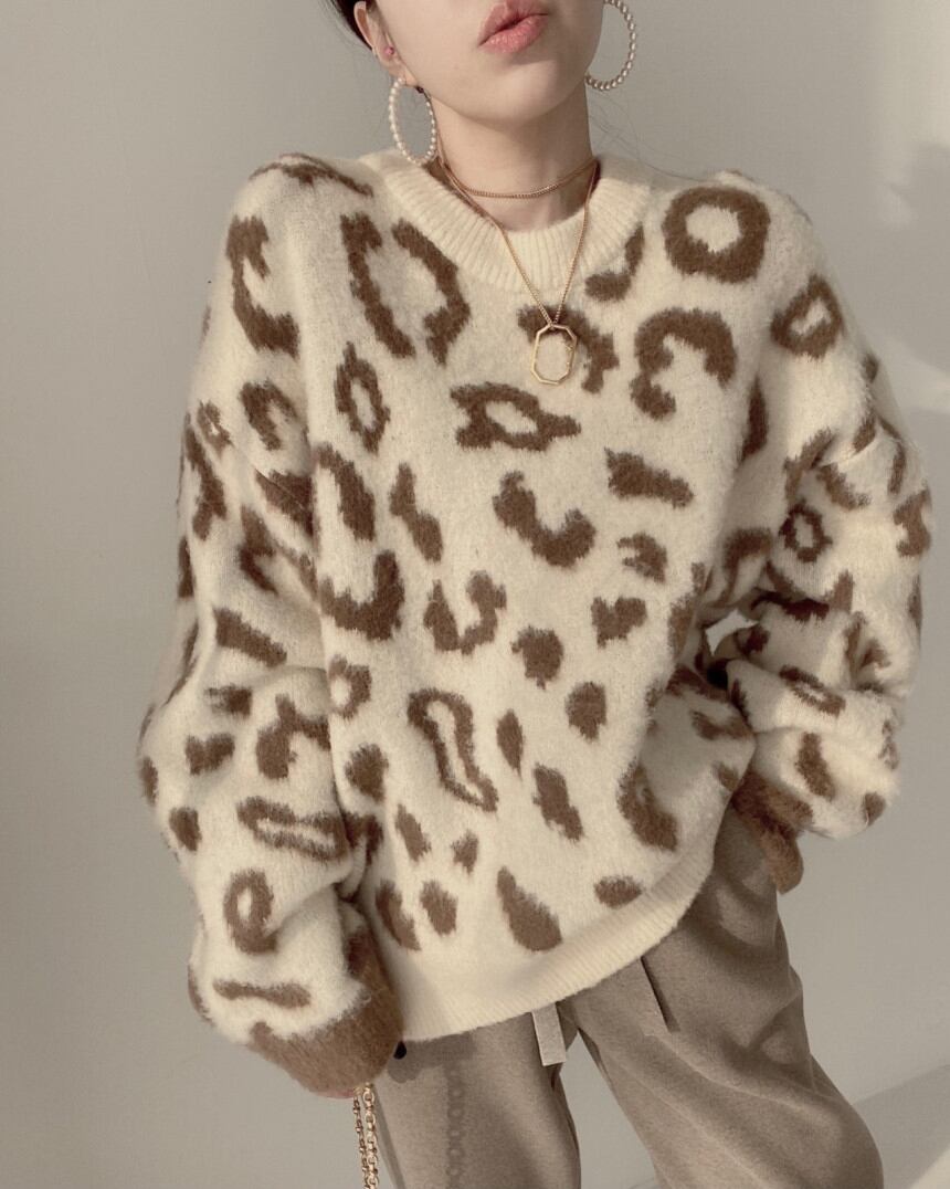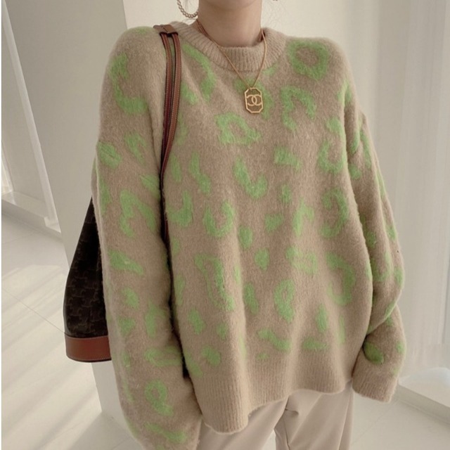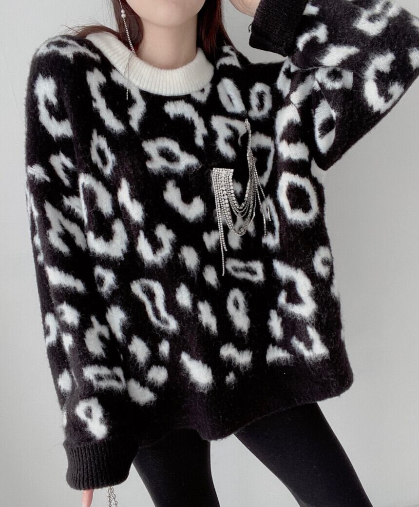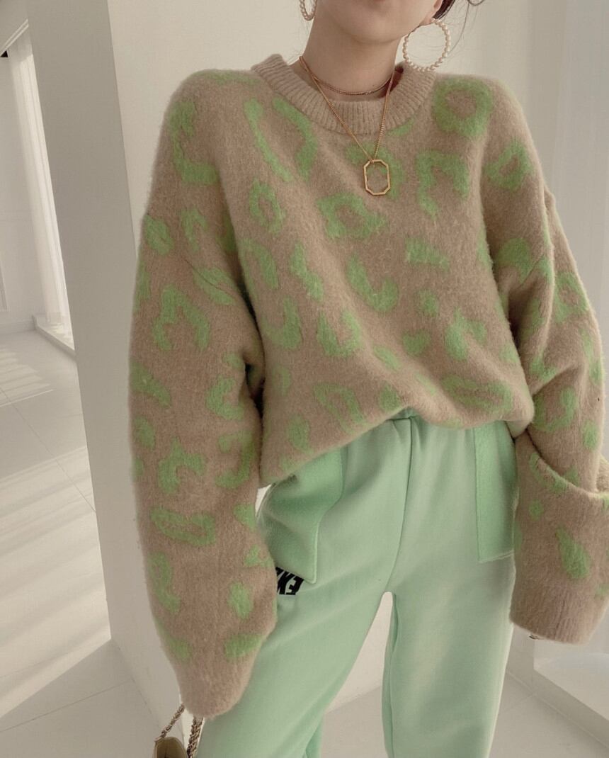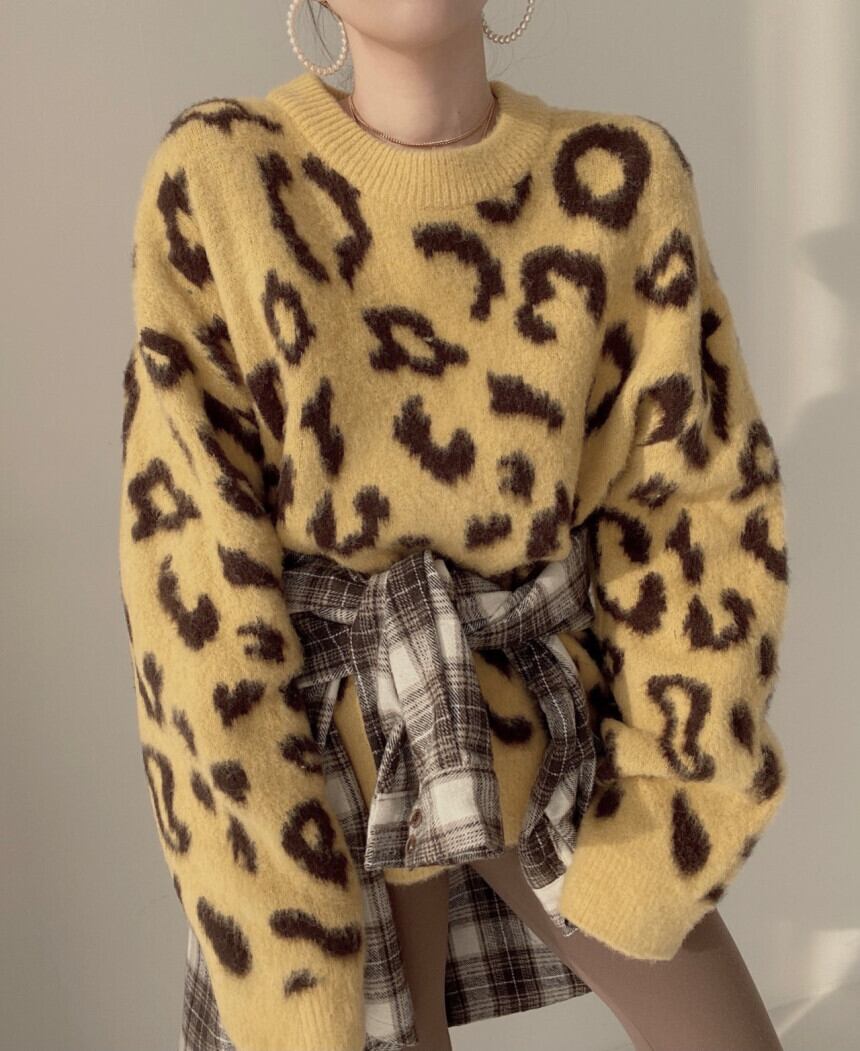 レオパード柄 ニット セーター トップス ショート ショート丈 袖あり 長袖 ドロップショルダー 萌袖 ラウンドネック 襟なし ふわふわ かわいい 大人可愛い カジュアル 大人 おしゃれ お洒落 大人女子 こなれ感 ルーズ 個性的 柄 ヒョウ柄 レオパード アニマル柄 春 秋 10代 20代 レディース 通勤 学生 通学 デート お出かけ 女子会 休日 旅行 着回し 普段使い 重ね着 韓国 韓国系 オルチャン ゆったり ゆる フリーサイズ 色展開 黒 ブラック 黄色 オフホワイト カーキ イエロー