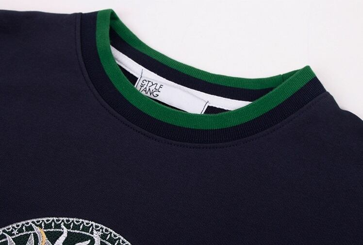 ユニーク柄の刺?入りラウンドネックトレーナー。