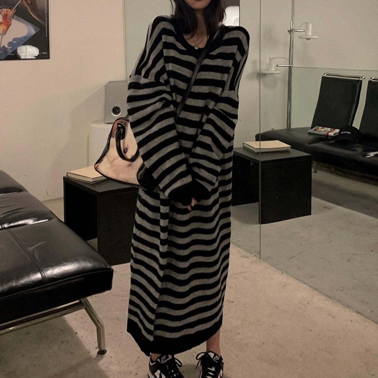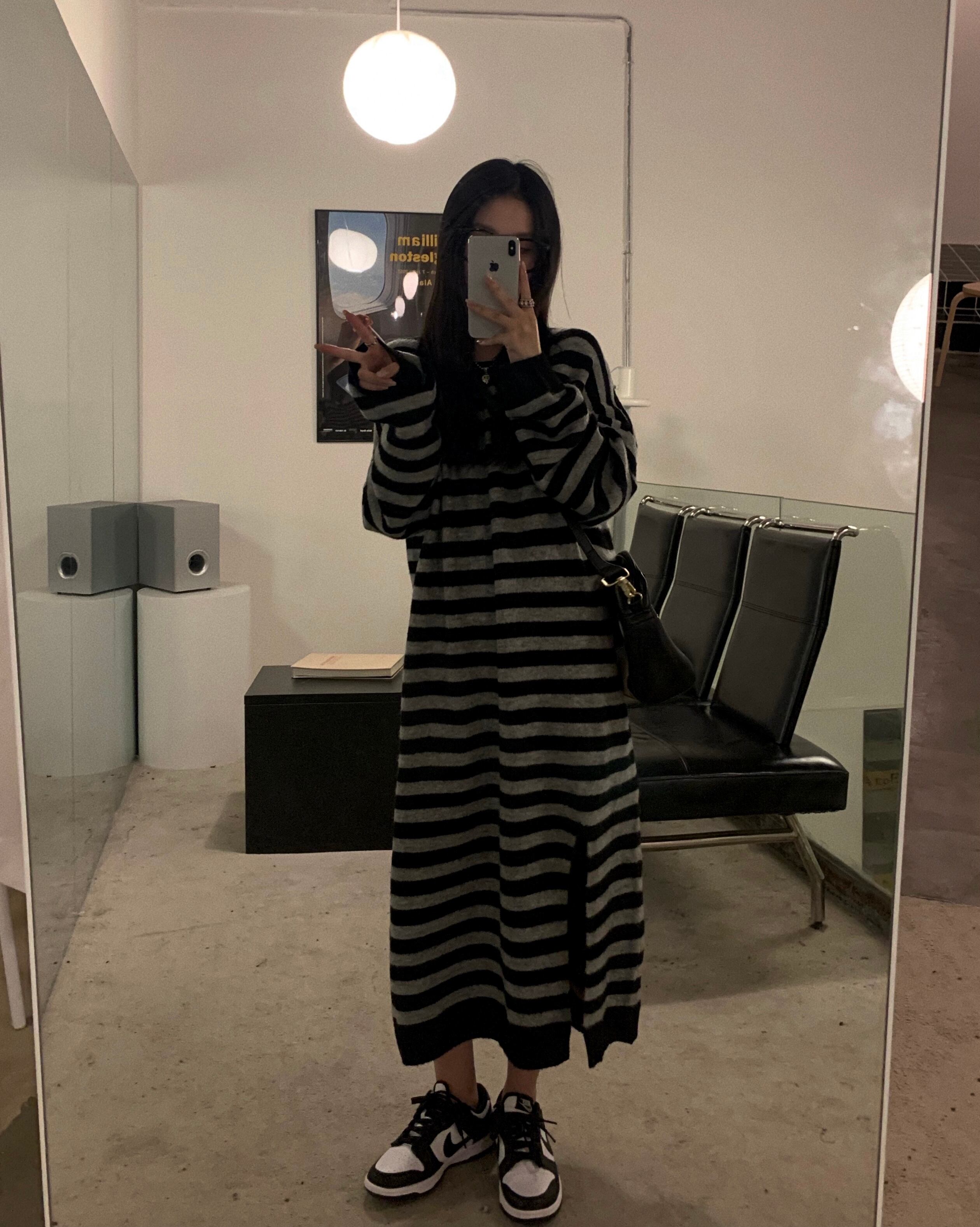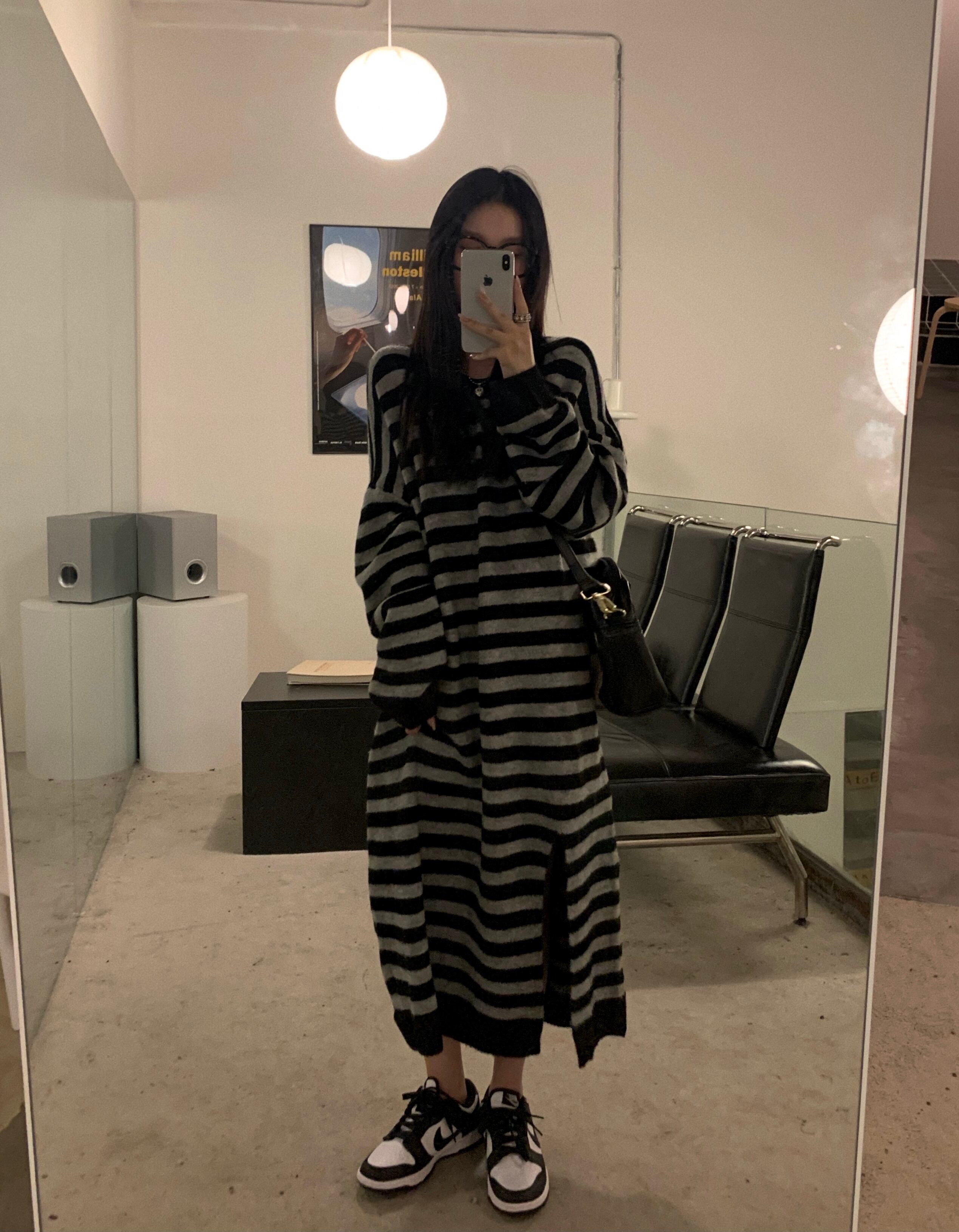 ボーダー柄 ミモレ丈 セーター ワンピース 膝下 ミモレ 袖あり 長袖 ドロップショルダー 萌袖 ラウンドネック 襟なし スリット サイドスリット 厚手 かわいい 大人可愛い シンプル カジュアル 大人 おしゃれ お洒落 大人女子 ラフ ルーズ 抜け感 柄 ボーダー 春 秋 10代 20代 レディース 通勤 学生 通学 デート お出かけ 女子会 休日 旅行 着回し 普段使い 重ね着 韓国 韓国系 オルチャン 体系カバー ゆったり ゆる フリーサイズ 黒 ブラック 灰色 グレー