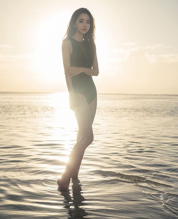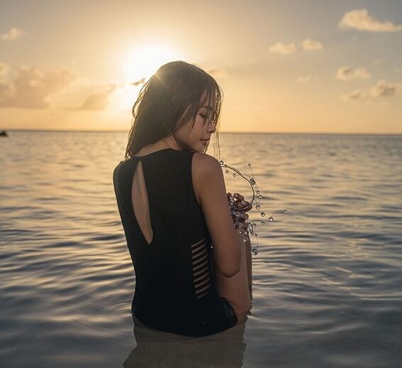 露出は控えめながらシアー感のあるVネックで大人セクシーに仕上がるワンピース水着。