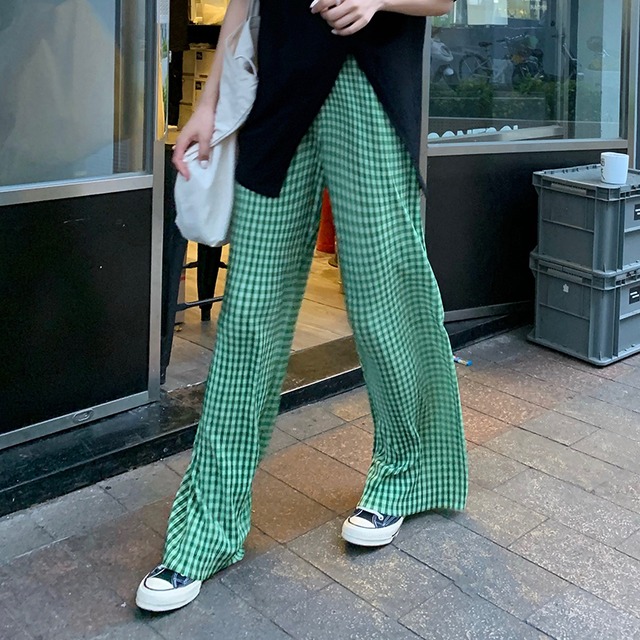 チェック柄 ハイウエスト カジュアルパンツ ボトムス パンツ ズボン ワイドパンツ ストレートパンツ ロング ロング丈 ストレート ワイド ハイウエスト ウエストゴム 伸縮性 かわいい 大人可愛い カジュアル 大人 おしゃれ お洒落 大人女子 こなれ感 ラフ ボーイッシュ ルーズ 個性的 柄 格子柄 春 夏 秋 10代 20代 レディース 通勤 学生 通学 デート お出かけ 女子会 休日 旅行 着回し 普段使い 韓国 韓国系 オルチャン 楽ちん ゆったり ゆる フリーサイズ 緑 グリーン