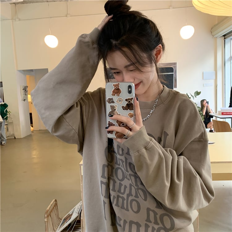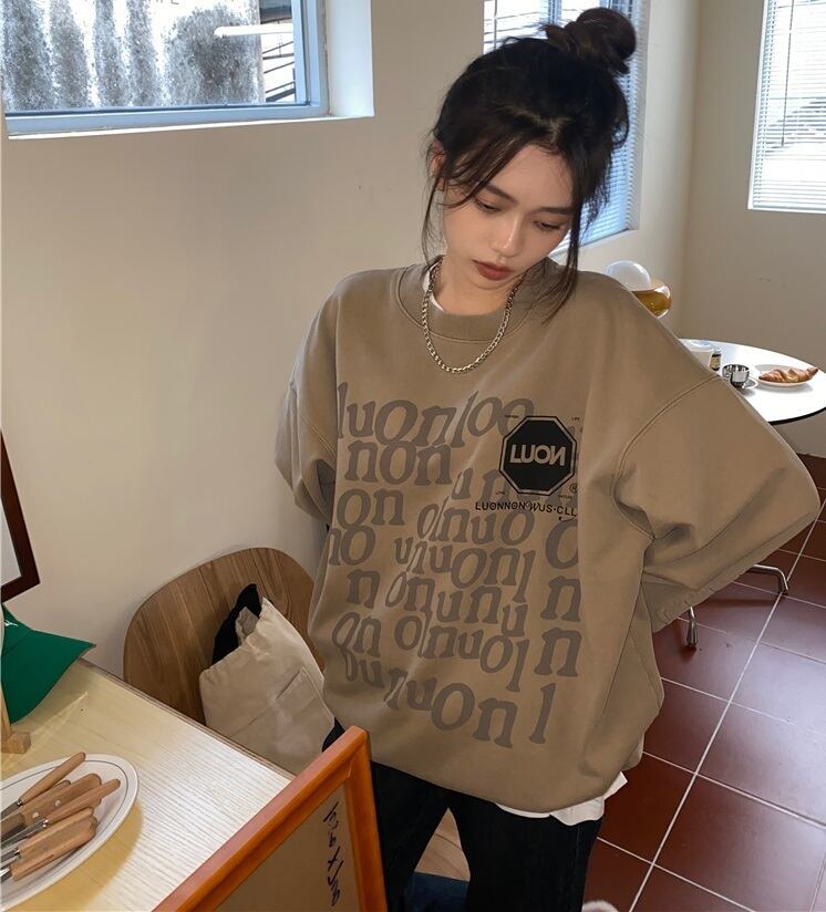 英字 ロゴ ラウンドネック トレーナー トップス プルオーバー ショート ショート丈 袖あり 長袖 ドロップショルダー 萌袖 襟なし かわいい 大人可愛い カジュアル 大人 おしゃれ お洒落 大人女子 こなれ感 ルーズ 柄 春 秋 冬 10代 20代 レディース 通勤 学生 通学 デート お出かけ 女子会 休日 旅行 着回し 普段使い 重ね着 韓国 韓国系 オルチャン ゆったり ゆる フリーサイズ 茶色 ブラウン