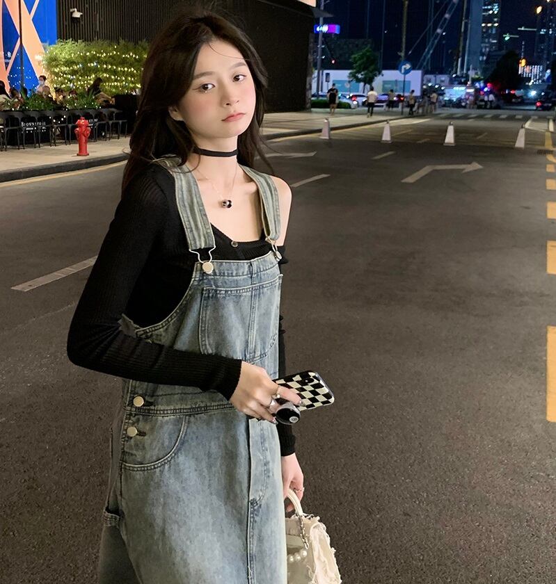 ヴィンテージライクなウォッシュデニムのサロペットスカート。