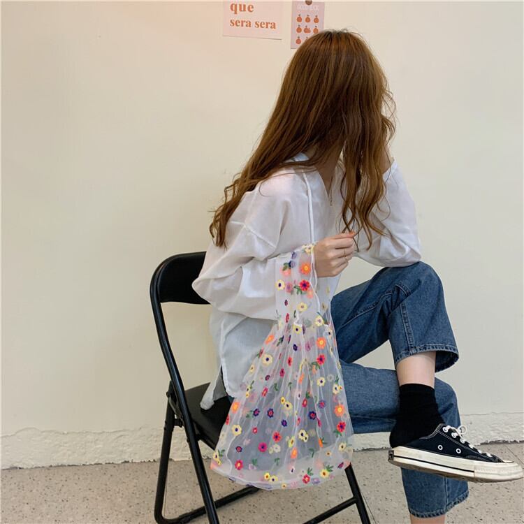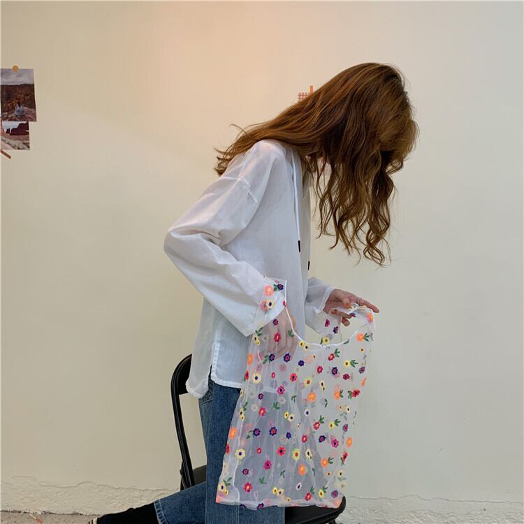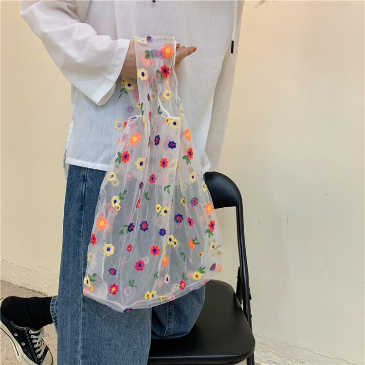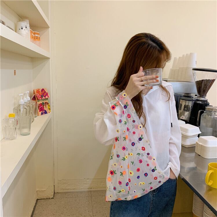 小花柄 チュール ハンドバッグ エコバッグ バッグ バック カバン かばん 鞄 レディースバッグ ハンドバック エコバック 便利 手持ち 折りたたみ 軽量 軽い 使いやすい 柔らかい スクエア型 四角 刺繍 フリル 薄手 かわいい 大人可愛い カジュアル 大人 おしゃれ お洒落 大人女子 ガーリー 個性的 柄 花柄 フラワー 10代 20代 レディース 通勤 学生 通学 デート お出かけ 女子会 休日 旅行 お買い物 デイリー 普段使い 韓国 韓国系 春 夏 サイズ 小さめ マルチカラー