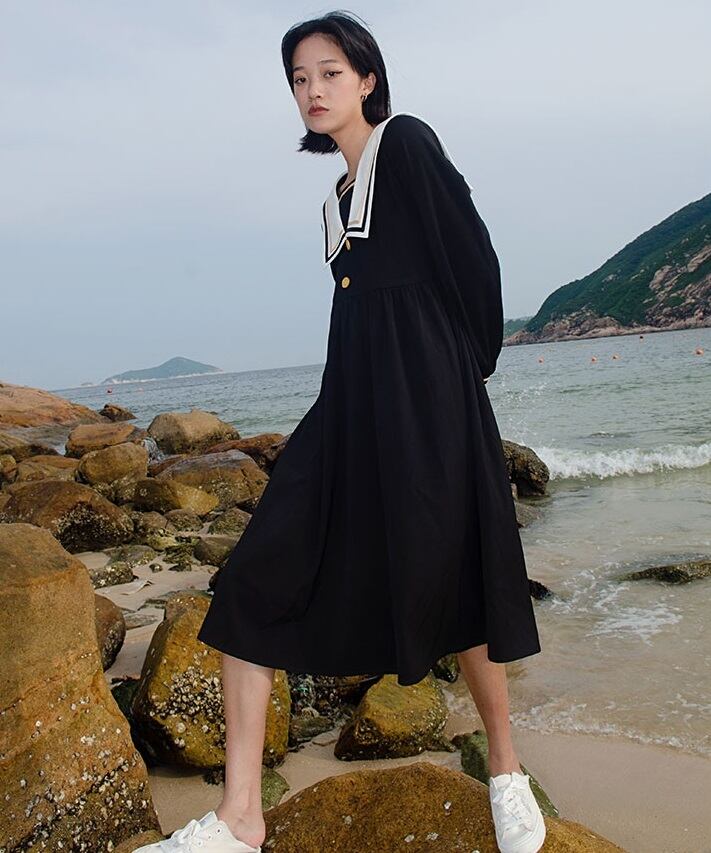 大きめ襟が目を惹く長袖ワンピース。