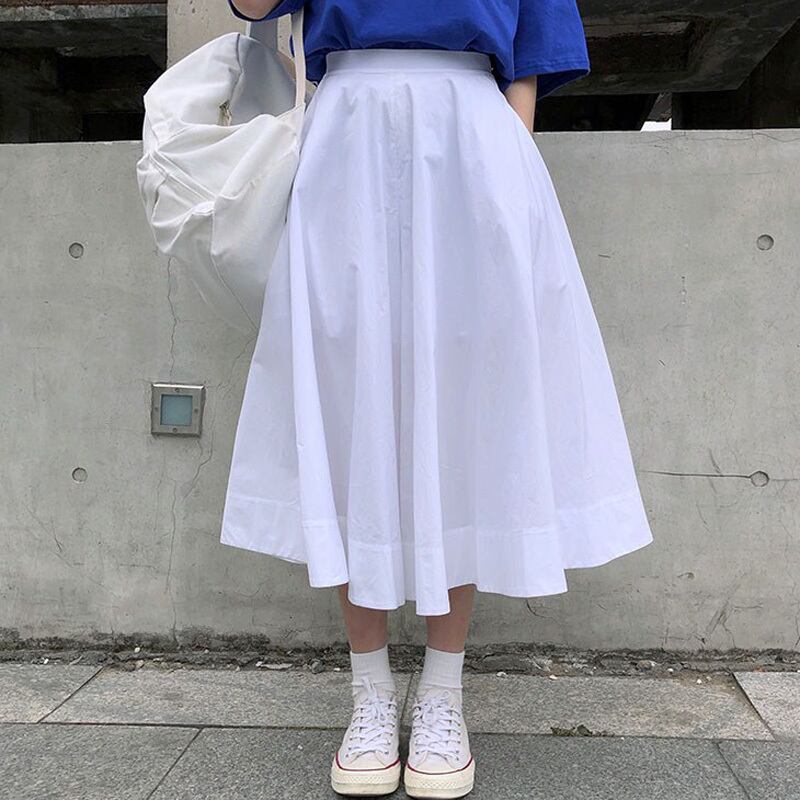ミモレ丈 ハイウエスト スカート ボトムス ロングスカート 膝下 ミモレ Aライン ポケット ウエストゴム 伸縮性 綿 かわいい 大人可愛い シンプル カジュアル 大人 おしゃれ お洒落 大人女子 無地 春 夏 秋 10代 20代 レディース 通勤 学生 通学 デート お出かけ 女子会 休日 旅行 着回し 普段使い 重ね着 サイズ S M L 色展開 白 ホワイト 黒 ブラック