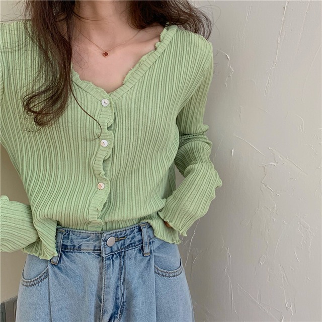 カラバリ リブ メロウ ニット カーディガン トップス ショート ショート丈 袖あり 長袖 萌袖 Vネック 襟なし スリム 細身 フリル 前開き リブニット かわいい 大人可愛い シンプル カジュアル 大人 おしゃれ お洒落 大人女子 ガーリー 無地 春 秋 10代 20代 レディース 通勤 学生 通学 デート お出かけ 女子会 休日 旅行 着回し 普段使い 重ね着 韓国 韓国系 春カラー フリーサイズ 色展開 黒 ブラック 緑 ミントグリーン 紫 パープル 茶色 ブラウン 黄色 イエロー ピンクオレンジ