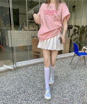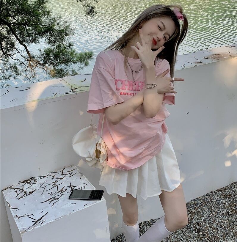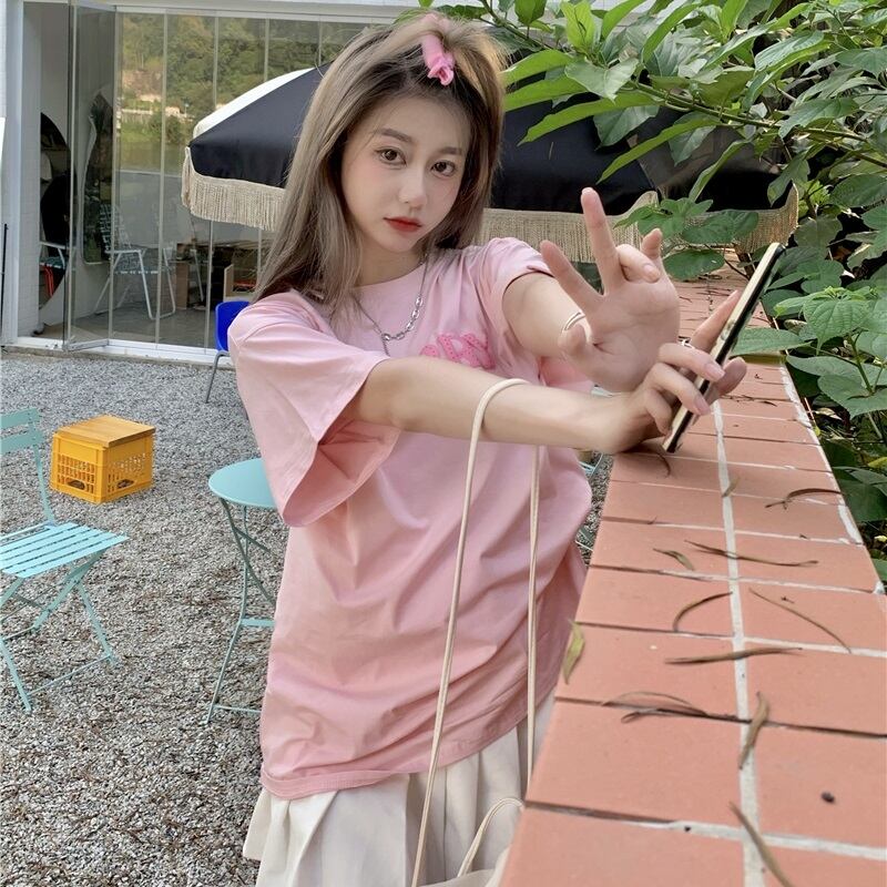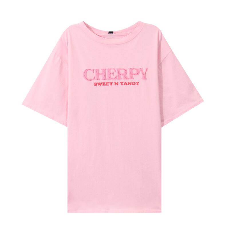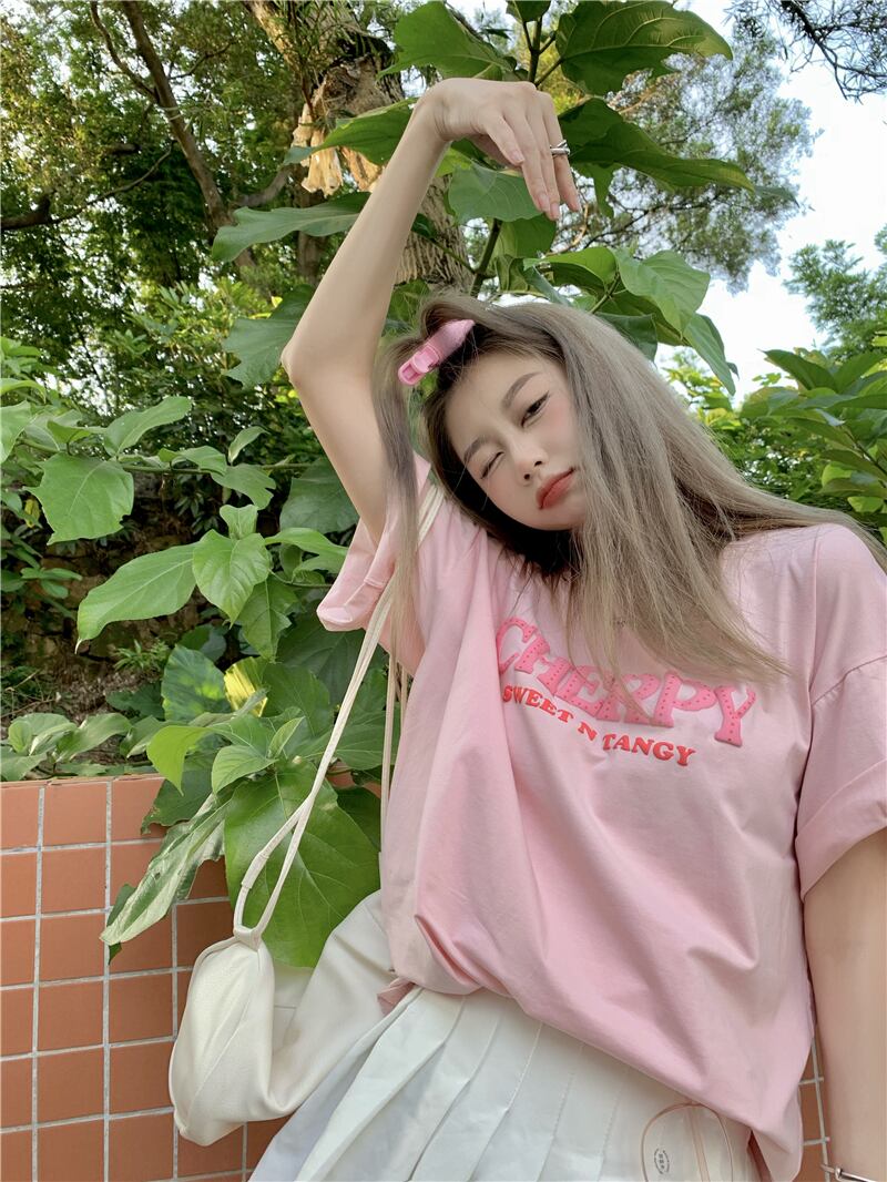 英字 ロゴ入り 半袖 Tシャツ トップス ミディアム丈 袖あり ラウンドネック 襟なし かわいい カジュアル おしゃれ お洒落 ラブリー キュート ガーリー ロゴ 夏 10代 20代 レディース 通勤 学生 通学 デート お出かけ 女子会 休日 旅行 着回し 普段使い 重ね着 韓国 韓国系 オルチャン ゆったり フリーサイズ ピンク