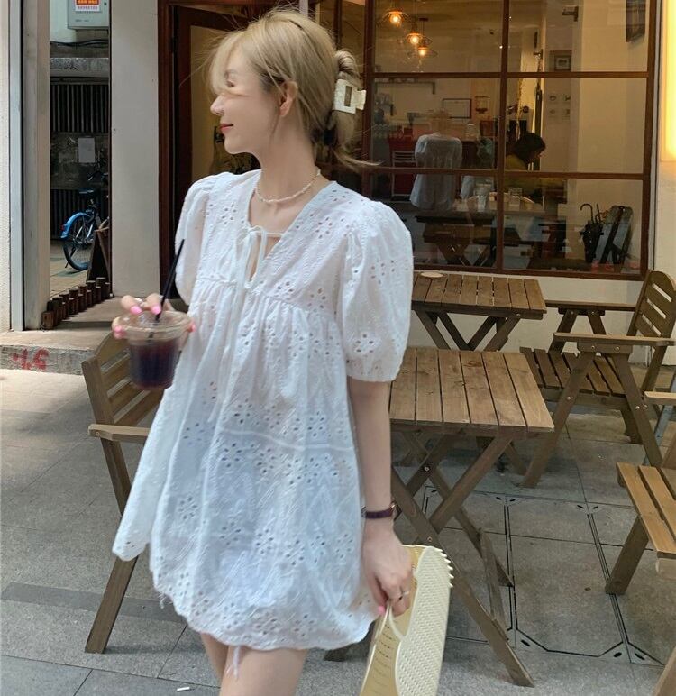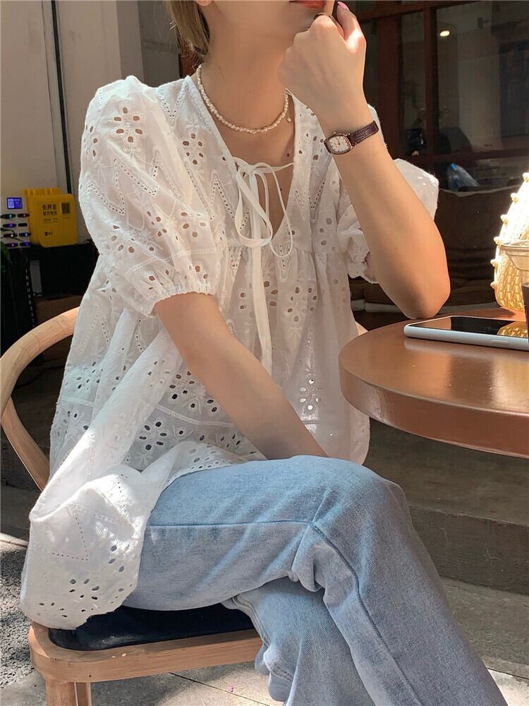 花柄 パンチングレース 半袖 ブラウス トップス ワンピース チュニック 白トップス ミディアム丈 袖あり パフスリーブ Vネック 襟なし レース リボン かわいい 大人可愛い シンプル カジュアル 大人 おしゃれ お洒落 レトロ 大人女子 ルーズ 柄 小花柄 フラワー 春 夏 10代 20代 レディース 通勤 学生 通学 デート お出かけ 女子会 休日 旅行 着回し 普段使い 重ね着 韓国 韓国系 オルチャン 楽ちん ゆったり ゆる フリーサイズ 白 ホワイト