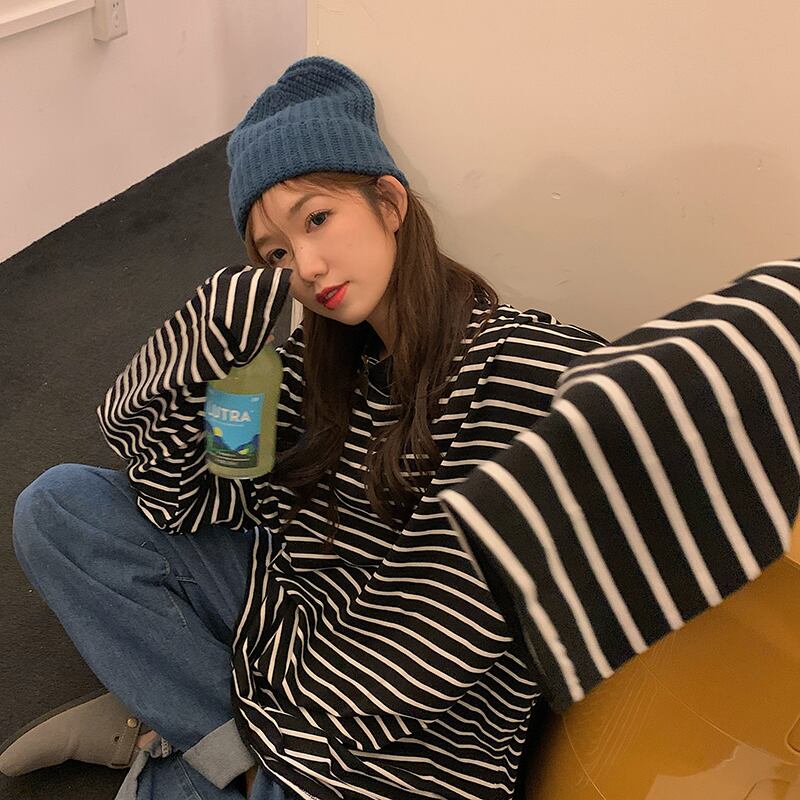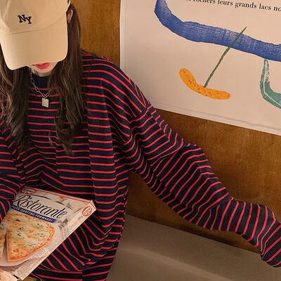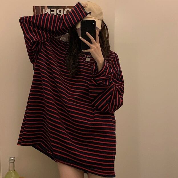 ボーダー柄 ラウンドネック ロンT トップス Tシャツ ミディアム丈 袖あり 長袖 ドロップショルダー 萌袖 襟なし かわいい 大人可愛い カジュアル 大人 おしゃれ お洒落 大人女子 こなれ感 ルーズ 柄 ボーダー シマ 春 秋 10代 20代 レディース 通勤 学生 通学 デート お出かけ 女子会 休日 旅行 着回し 普段使い 重ね着 韓国 韓国系 オルチャン ゆったり ゆる フリーサイズ 色展開 黒 ブラック 赤 レッド
