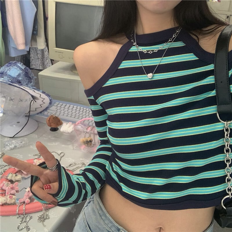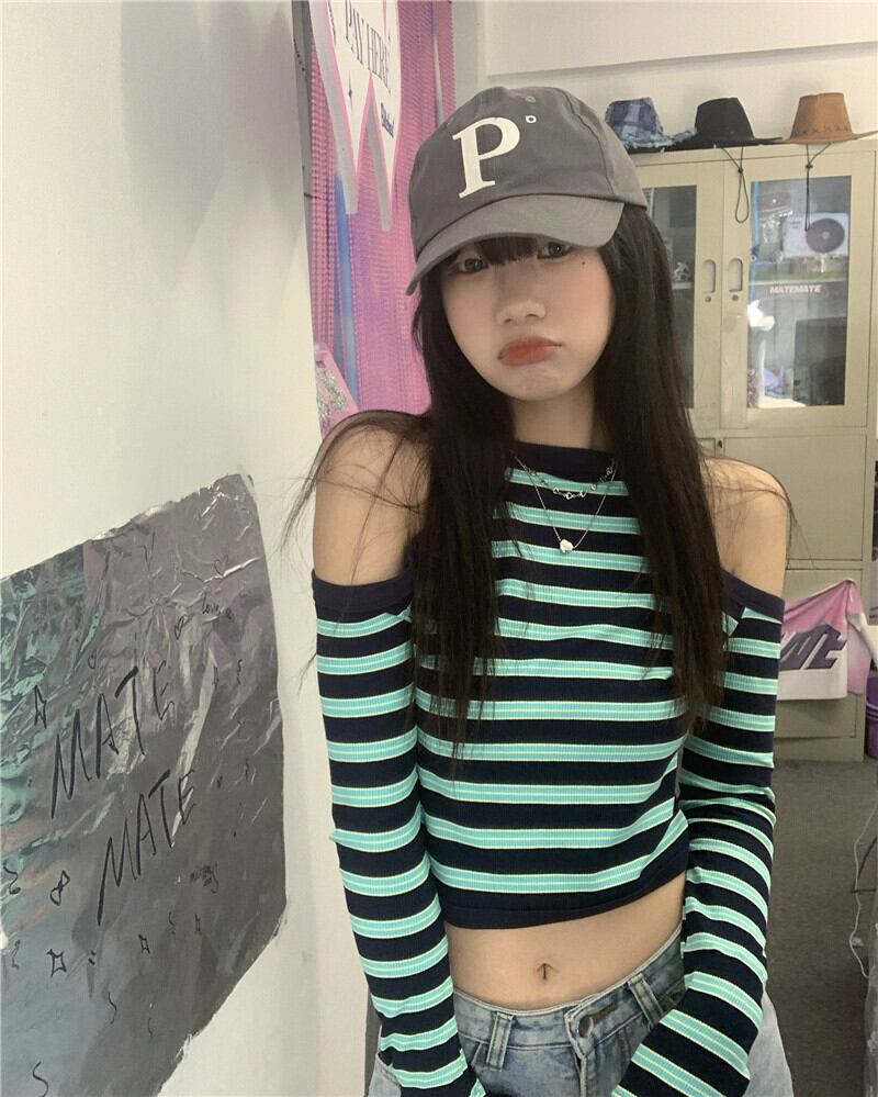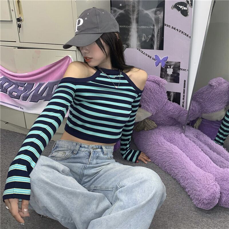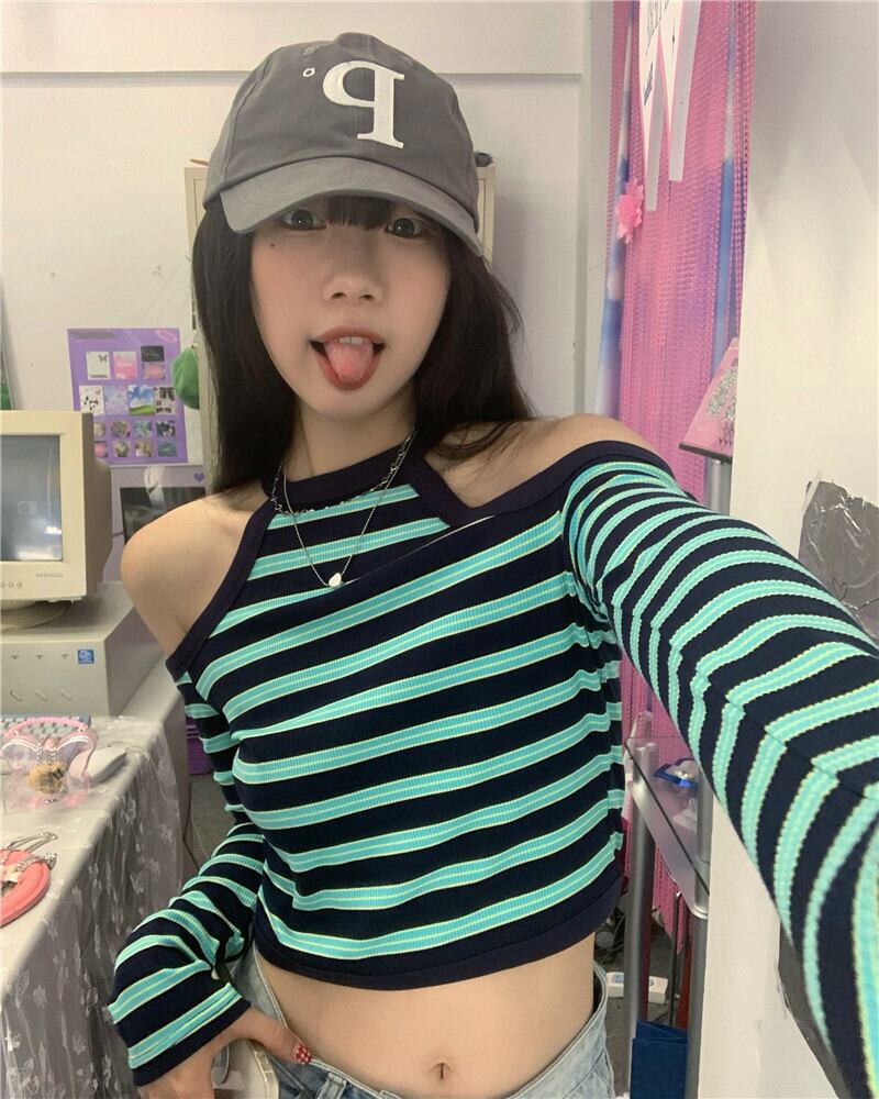 ボーダー柄 ショート丈 肩出し ロンT トップス Tシャツ ショート 袖あり 長袖 ラウンドネック 襟なし スリム タイト 細身 綿 薄手 かわいい 大人可愛い カジュアル 大人 おしゃれ お洒落 大人女子 こなれ感 個性的 柄 ボーダー シマ 春 秋 10代 20代 レディース 通勤 学生 通学 デート お出かけ 女子会 休日 旅行 着回し 普段使い 重ね着 韓国 韓国系 オルチャン フリーサイズ 緑 グリーン