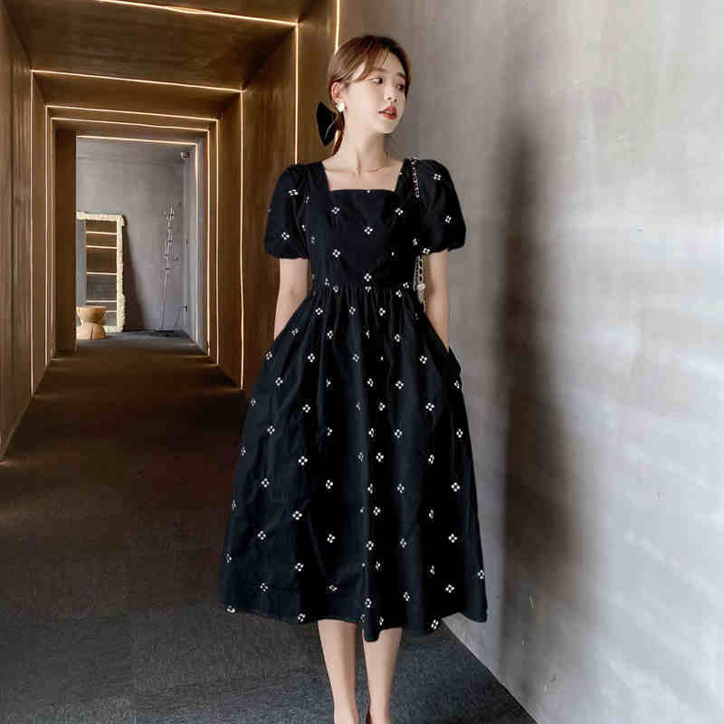 小花柄 スクエアネック ミモレ丈 ワンピース 膝下 ミモレ 袖あり 半袖 パフスリーブ 襟なし スリム 細身 Aライン 切り替えデザイン バックシャン バックコンシャス ハイウエスト かわいい 大人可愛い シンプル カジュアル 大人 上品 おしゃれ お洒落 レトロ 大人女子 柄 花柄 フラワー 夏 10代 20代 レディース 通勤 学生 通学 デート お出かけ 女子会 休日 旅行 着回し 普段使い 重ね着 韓国 韓国系 オルチャン 大きいサイズ S M L XL 2XL 3XL 黒 ブラック