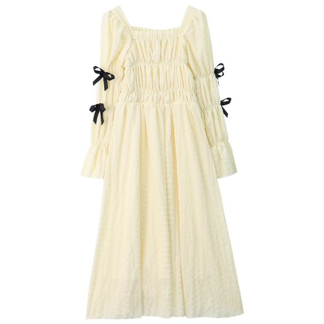 スクエアネック ミモレ丈 ワンピース ワンピドレス 膝下 ミモレ 袖あり 長袖 フレアスリーブ 襟なし フレア 切り替えデザイン リボン ハイウエスト かわいい 大人可愛い 大人 おしゃれ お洒落 大人女子 ラブリー キュート ガーリー 主役級 存在感 無地 春 秋 10代 20代 レディース 通勤 学生 通学 デート お出かけ 女子会 休日 パーティー イベント 旅行 着回し 普段使い 重ね着 韓国 韓国系 オルチャン フリーサイズ アプリコット