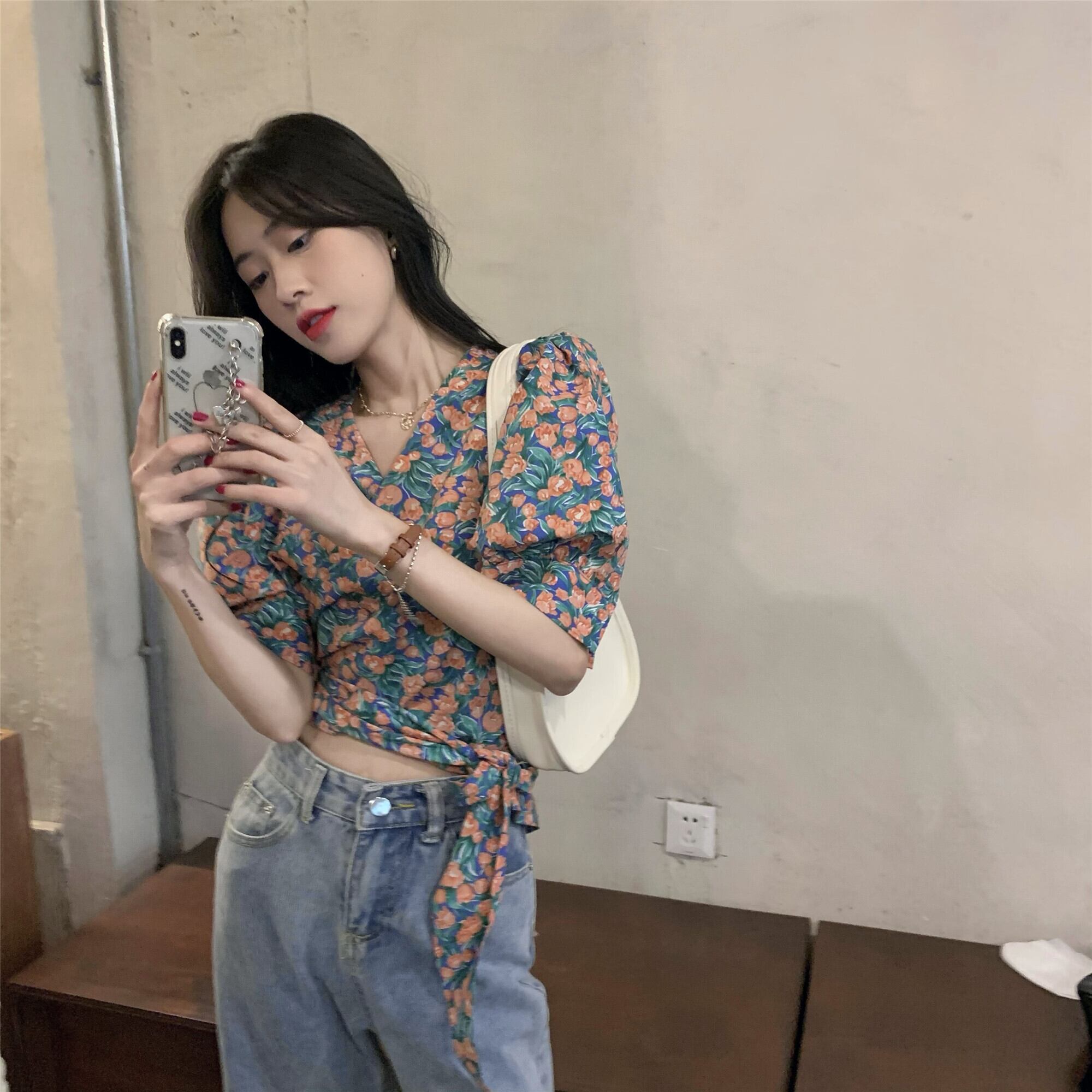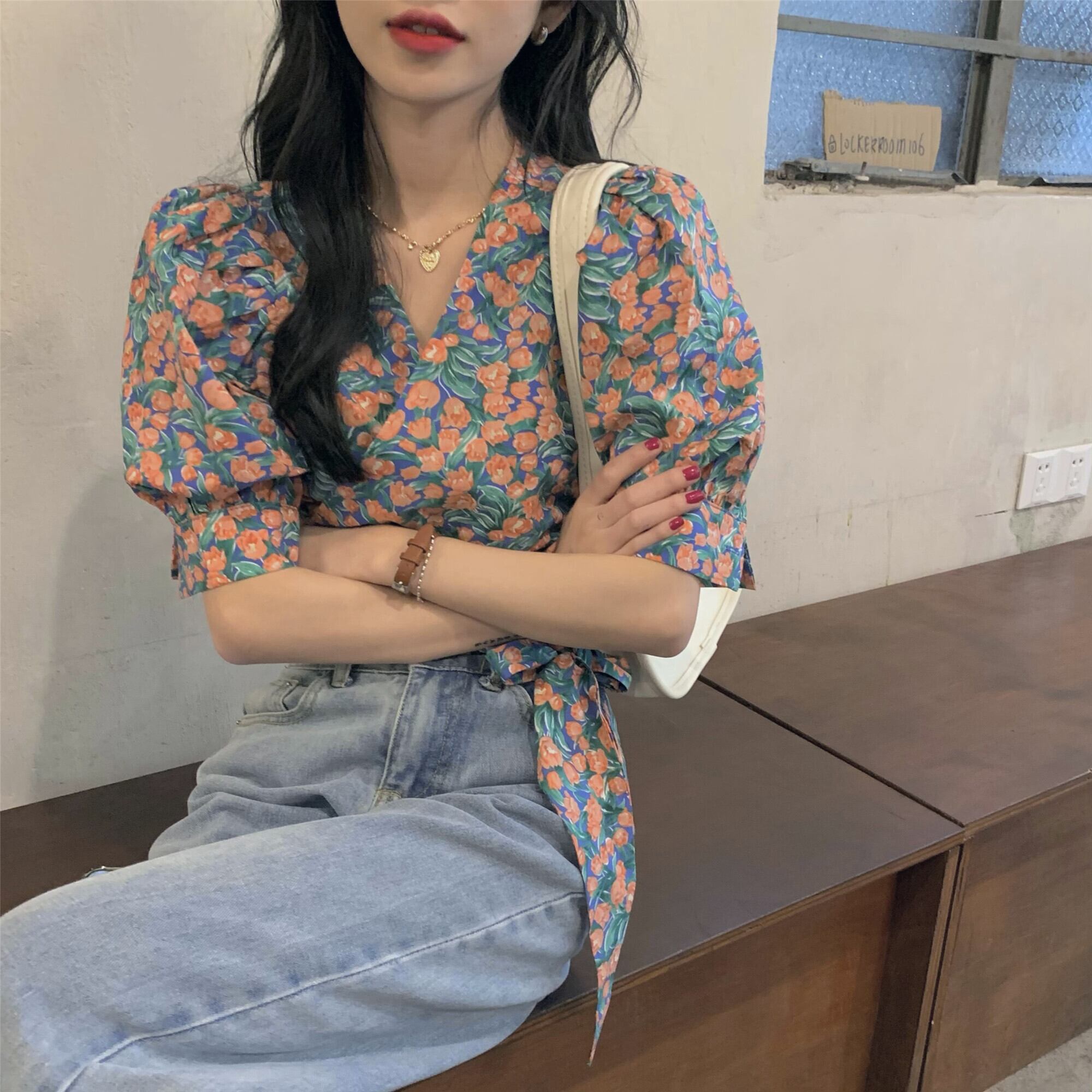 総花柄 パフスリーブ ショート丈 ブラウス トップス ショート 袖あり 半袖 Vネック カシュクール 襟なし スリム 細身 リボン ウエストリボン かわいい 大人可愛い きれいめ カジュアル 大人 上品 おしゃれ お洒落 レトロ 大人女子 ラブリー キュート ガーリー 個性的 主役級 存在感 柄 小花柄 フラワー 春 夏 10代 20代 レディース 通勤 学生 通学 デート お出かけ 女子会 休日 旅行 着回し 普段使い 重ね着 韓国 韓国系 オルチャン フリーサイズ 花柄