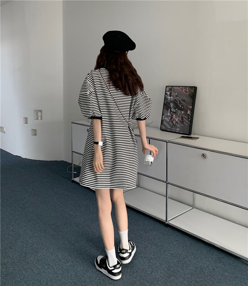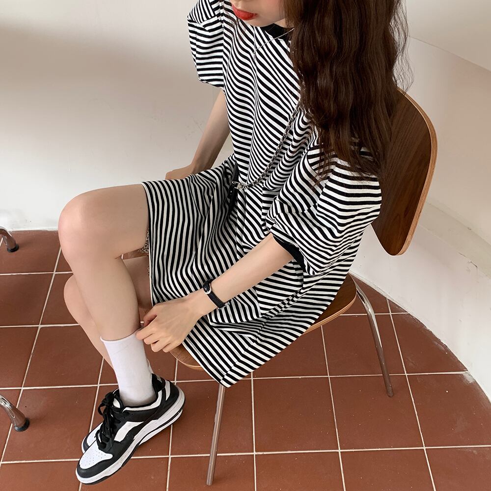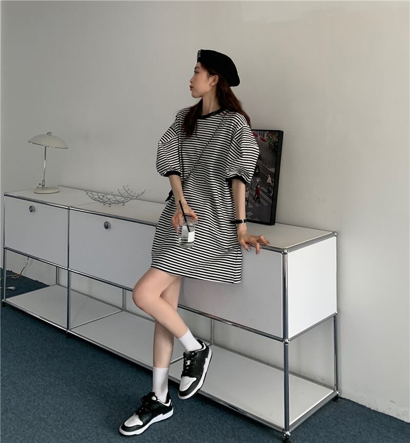 ボーダー柄 半袖 Tシャツワンピース ミニ ワンピース Tシャツ ミニ丈 袖あり 5分袖 五分袖 パフスリーブ ラウンドネック 襟なし かわいい 大人可愛い カジュアル 大人 おしゃれ お洒落 大人女子 ルーズ 主役級 柄 ボーダー シマ 夏 10代 20代 レディース 通勤 学生 通学 デート お出かけ 女子会 休日 旅行 着回し 普段使い 重ね着 韓国 韓国系 オルチャン 楽ちん ゆったり ゆる フリーサイズ ボーダー柄