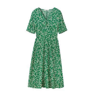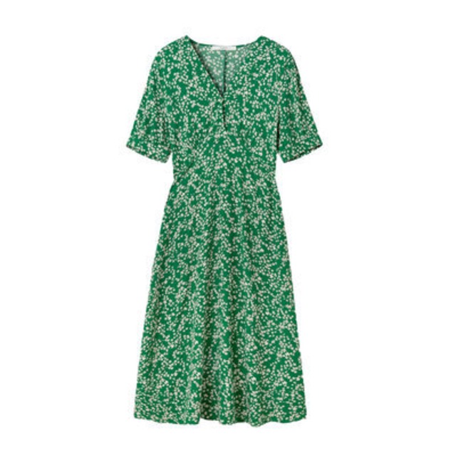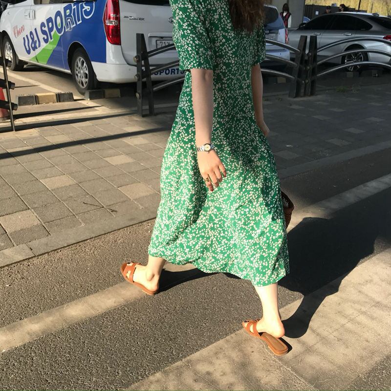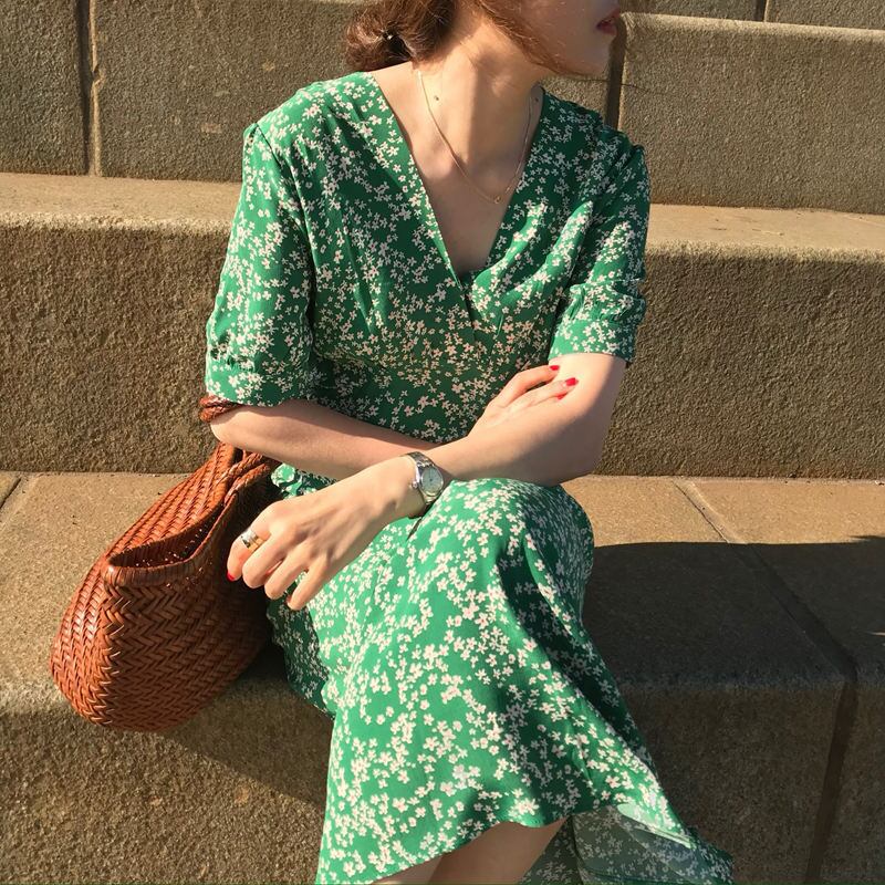 小花柄 半袖 Vネック カシュクール ワンピース 膝下 ミモレ ミモレ丈 袖あり 襟なし スリム 細身 Aライン 切り替えデザイン ハイウエスト かわいい 大人可愛い カジュアル 大人 おしゃれ お洒落 大人女子 主役級 柄 花柄 フラワー 春 夏 10代 20代 30代 レディース 通勤 学生 通学 デート お出かけ 女子会 休日 旅行 着回し 普段使い 重ね着 韓国 韓国系 オルチャン 楽ちん フリーサイズ 緑 グリーン
