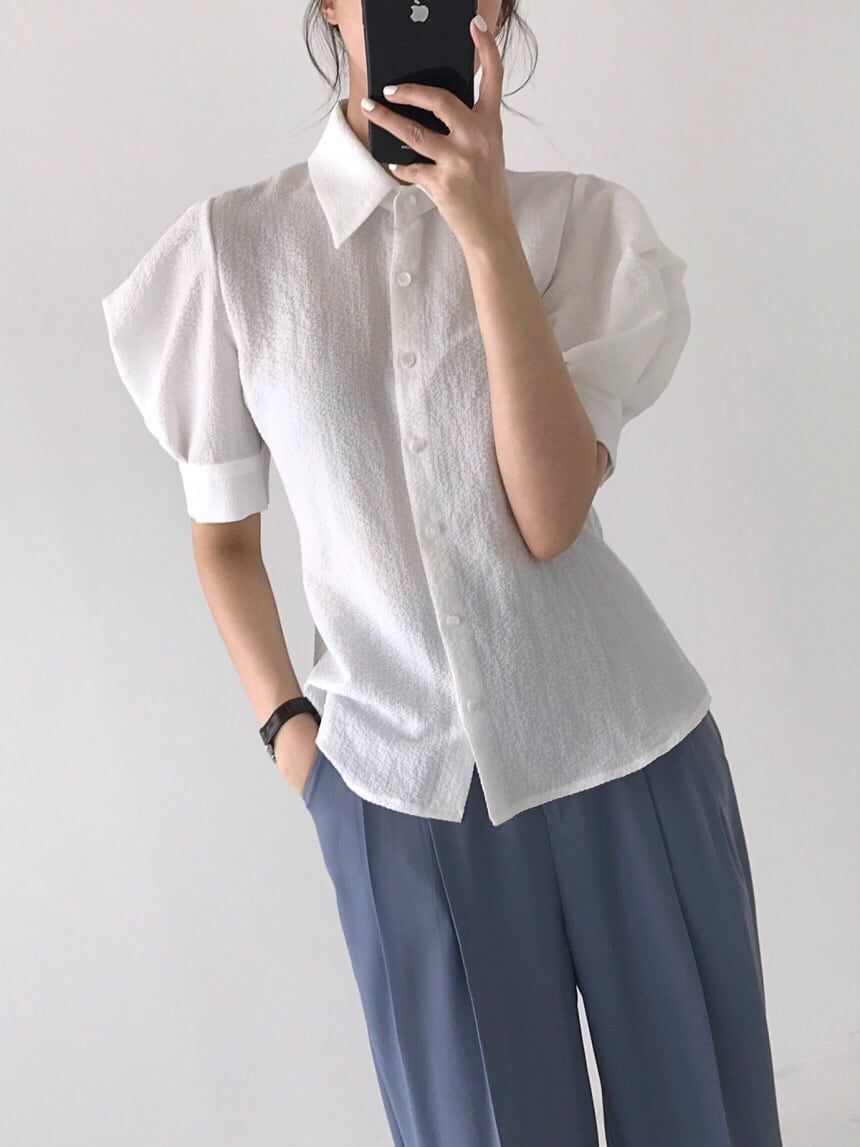 シンプルながらパフ袖が今っぽかわいい半袖シャツ。