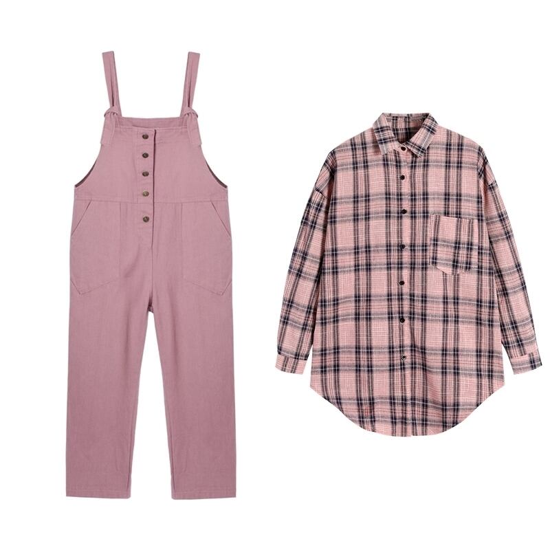 チェック柄のシャツと9分丈サロペットの2点セット。