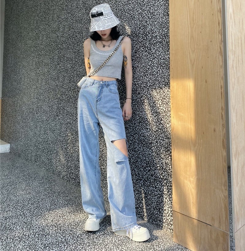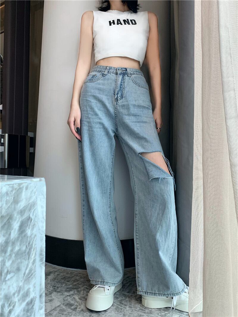 ハイウエスト ダメージ デニムパンツ ボトムス パンツ Gパン ズボン ワイドパンツ ロング ロング丈 ストレート ワイド ファスナー ポケット デニム ブルーデニム かわいい 大人可愛い シンプル カジュアル 大人 おしゃれ お洒落 かっこいい 大人女子 こなれ感 メンズライク ボーイッシュ ルーズ 個性的 クール 無地 春 夏 秋 冬 10代 20代 レディース 通勤 学生 通学 デート お出かけ 女子会 休日 旅行 着回し 普段使い 韓国 穴あき 定番 ゆったり サイズ S M L 青 ブルー