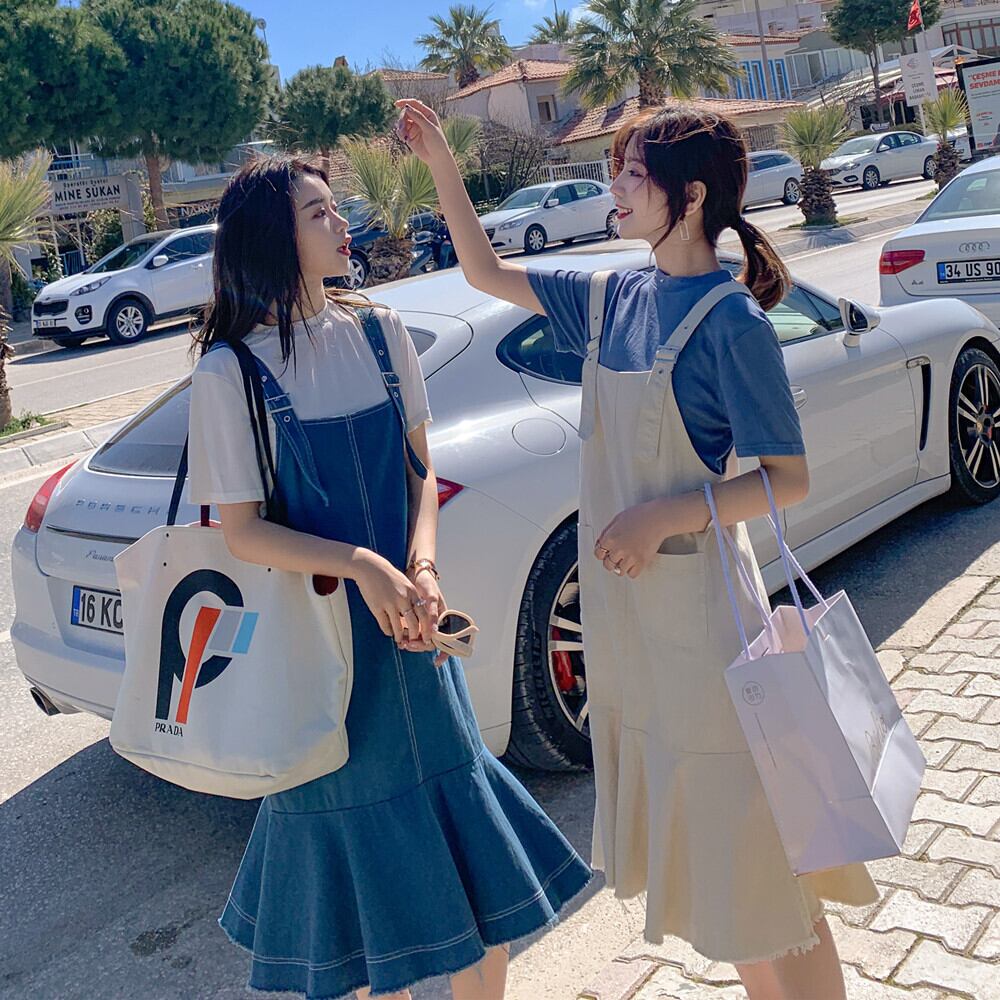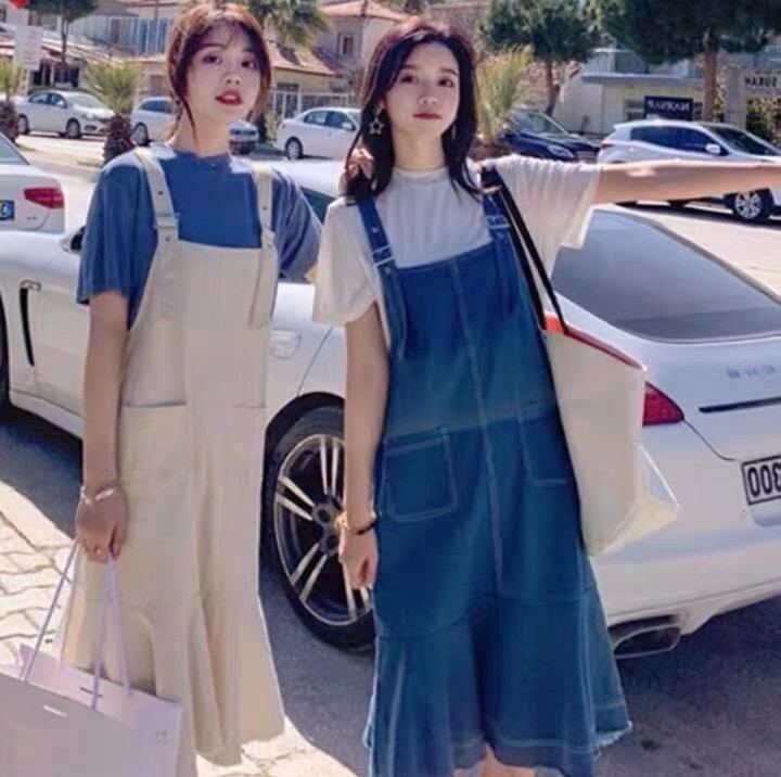 カラバリ セットアップ Tシャツ デニム サロペット 2点セット トップス ボトムス 膝下 ミモレ ミモレ丈 半袖 ラウンドネック フレア マーメイド ツーピース かわいい 大人可愛い シンプル カジュアル おしゃれ お洒落 無地 春 夏 秋 10代 20代 レディース 通勤 学生 通学 デート お出かけ 女子会 休日 旅行 着回し 普段使い 重ね着 お揃い 双子 韓国 サイズ S M L 色展開 白 ホワイト 青 ブルー 黄色 オフホワイト イエロー ピンク 水色 アプリコット ライトブルー