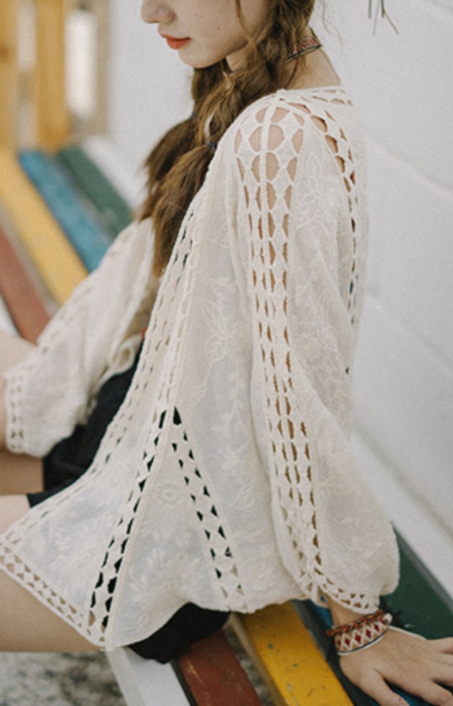 透かし編み Vネック カーディガン トップス ミディアム丈 袖あり 7分袖 七分袖 ドルマンスリーブ 襟なし レース 刺繍 前開き クロシェ 編み込み 透け感 かわいい 大人可愛い カジュアル 大人 おしゃれ お洒落 レトロ アジアン エスニック 大人女子 ルーズ 個性的 柄 花柄 小花柄 フラワー 春 夏 10代 20代 レディース 通勤 学生 通学 デート お出かけ 女子会 休日 リゾート 旅行 海 プール 着回し 普段使い 重ね着 ゆったり フリーサイズ 色展開 白 ホワイト アプリコット