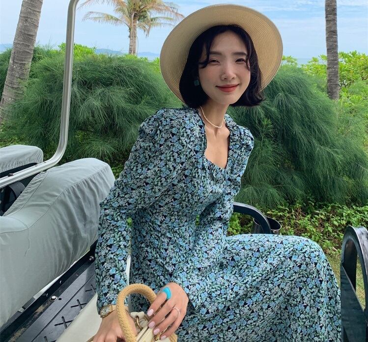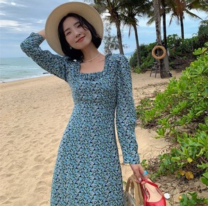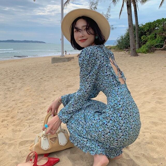 背中開き レースアップ 総花柄 ワンピース 膝下 ミモレ ミモレ丈 袖あり 長袖 スクエアネック 襟なし スリム 細身 Aライン バックリボン バックシャン バックコンシャス かわいい 大人可愛い カジュアル 大人 おしゃれ お洒落 大人女子 個性的 主役級 存在感 柄 花柄 小花柄 フラワー プリント 春 秋 10代 20代 レディース 通勤 学生 通学 デート お出かけ 女子会 休日 リゾート 旅行 海 着回し 普段使い 韓国 韓国系 オルチャン サイズ S M 青 ブルー