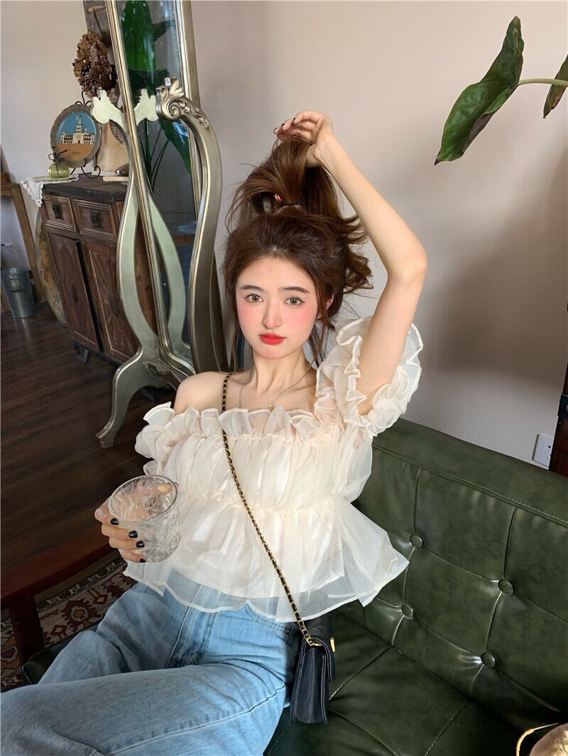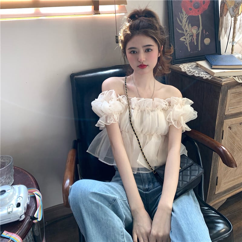 オフショル パフスリーブ ブラウス トップス プルオーバー 白トップス ショート ショート丈 袖あり 半袖 オフショルダー 襟なし チュール シフォン フリル 透け感 かわいい 大人可愛い カジュアル 大人 おしゃれ お洒落 大人女子 ラブリー キュート ガーリー 主役級 無地 夏 10代 20代 レディース 通勤 学生 通学 デート お出かけ 女子会 休日 旅行 着回し 普段使い 重ね着 韓国 韓国系 オルチャン フリーサイズ 白 ホワイト