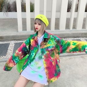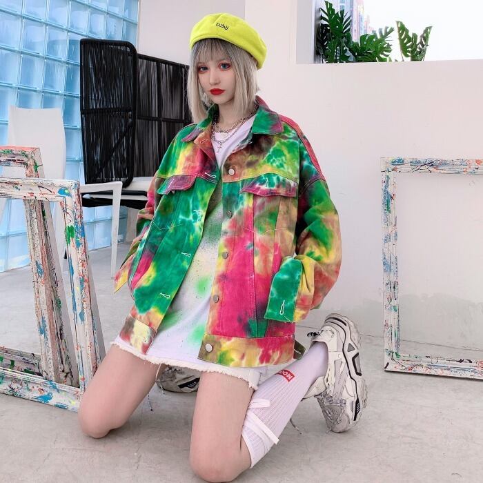 絞り染め 長袖 デニム ジャケット アウター 上着 ミディアム丈 袖あり ドロップショルダー 襟付き ポケット 前開き 綿 カラーデニム かわいい 大人可愛い カジュアル 大人 おしゃれ お洒落 かっこいい 大人女子 こなれ感 メンズライク ボーイッシュ ルーズ 個性的 クール 主役級 存在感 柄 絞り染め 春 秋 10代 20代 レディース 通勤 学生 通学 デート お出かけ 女子会 休日 旅行 着回し 普段使い 重ね着 韓国 韓国系 ゆったり ゆる サイズ S M L 色展開 カラフル