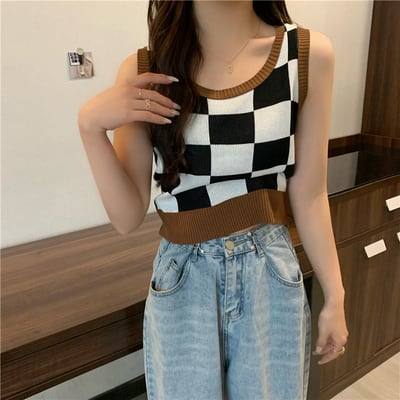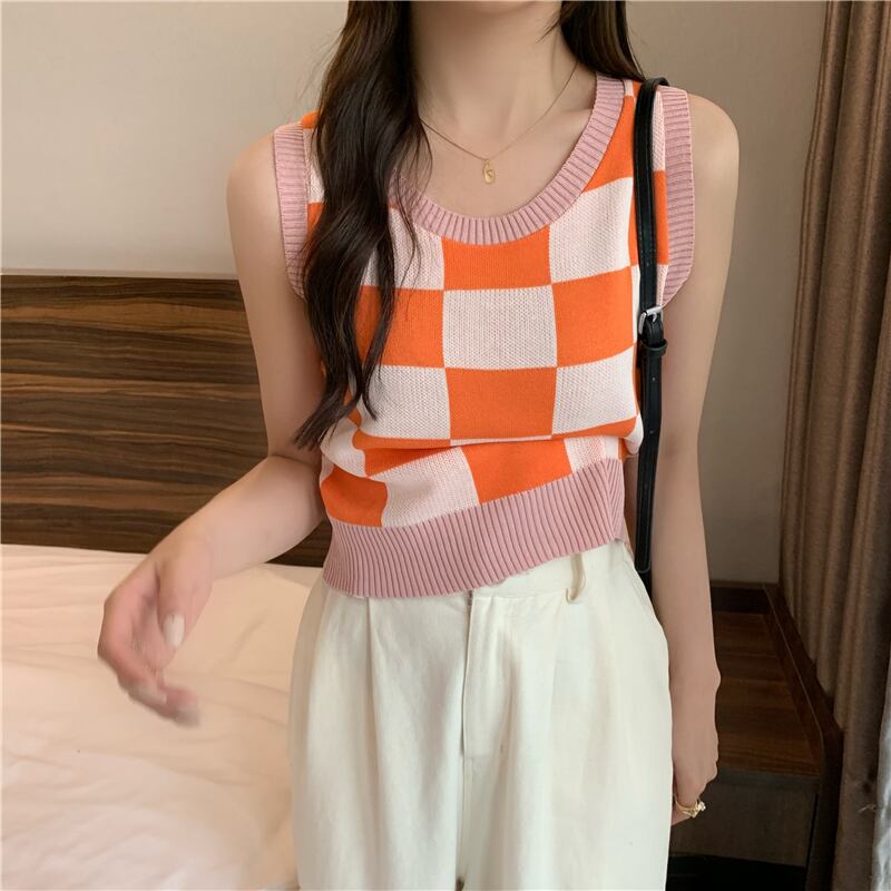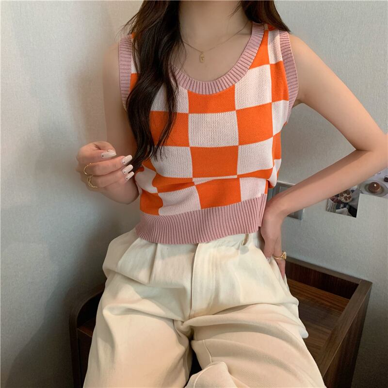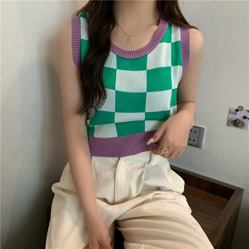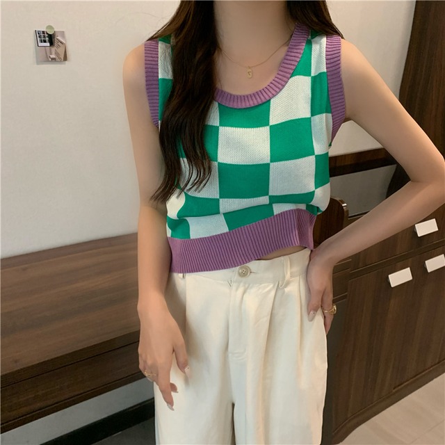 チェッカー柄 ノースリーブ サマーニット トップス ニットソー セーター ショート ショート丈 袖なし ラウンドネック 襟なし スリム タイト 細身 伸縮性 ニット かわいい 大人可愛い シンプル カジュアル 大人 おしゃれ お洒落 大人女子 こなれ感 主役級 存在感 柄 チェック柄 格子柄 夏 10代 20代 レディース 通勤 学生 通学 デート お出かけ 女子会 休日 旅行 着回し 普段使い 重ね着 韓国 韓国系 オルチャン フリーサイズ 色展開 青 ブルー 紫 パープル 茶色 ブラウン ピンク