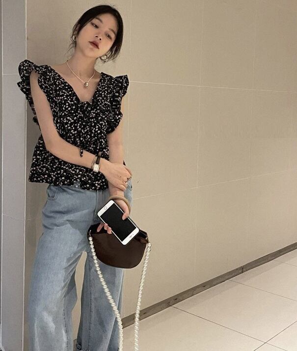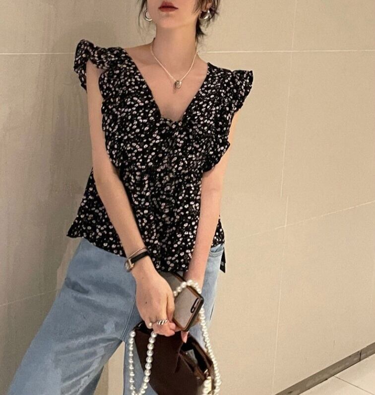 花柄 ノースリーブ ブラウス トップス ショート ショート丈 袖なし フレンチスリーブ Vネック 襟なし フリル かわいい 大人可愛い カジュアル 大人 おしゃれ お洒落 レトロ 大人女子 柄 小花柄 フラワー 夏 10代 20代 レディース 通勤 学生 通学 デート お出かけ 女子会 休日 旅行 着回し 普段使い 韓国 韓国系 オルチャン フリーサイズ 黒 ブラック