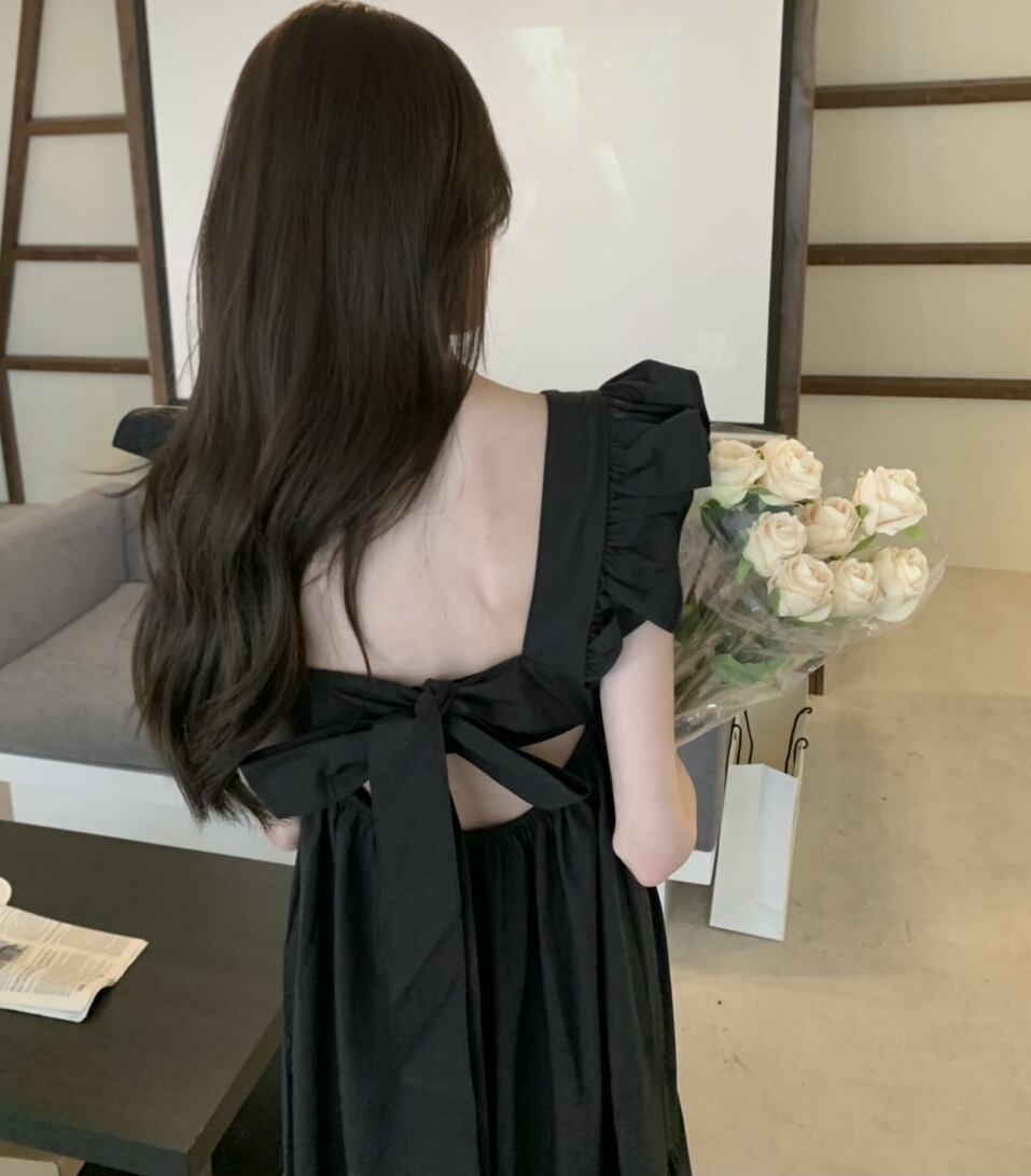 長めの丈感が大人の女性らしい1枚で、後ろ姿も背中魅せのリボン結びでかわいいシルエットに。