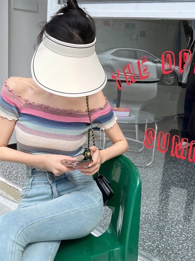 ストライプカラーが映え、ウエストのチラ見せコーデも大人かわいくキマるitem。