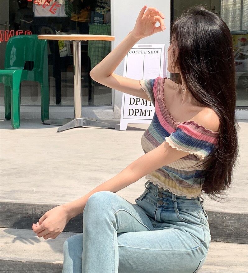 カラバリ リブメロウ フリル ショート丈 サマーニット トップス ニットソー セーター ショート 袖あり 半袖 フレンチスリーブ スクエアネック 襟なし スリム タイト 細身 リブ リブニット 伸縮性 ニット かわいい 大人可愛い きれいめ シンプル カジュアル 大人 おしゃれ お洒落 大人女子 ガーリー 主役級 存在感 柄 ボーダー シマ 夏 10代 20代 レディース 通勤 学生 通学 デート お出かけ 女子会 休日 旅行 着回し 普段使い 重ね着 韓国 韓国系 フリーサイズ 色展開 青 ブルー 緑