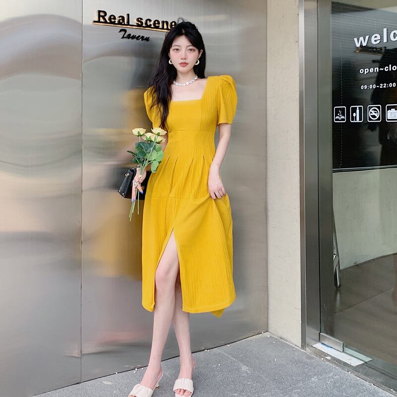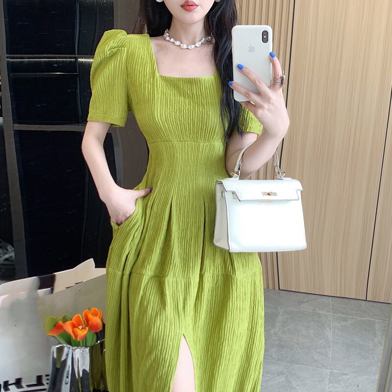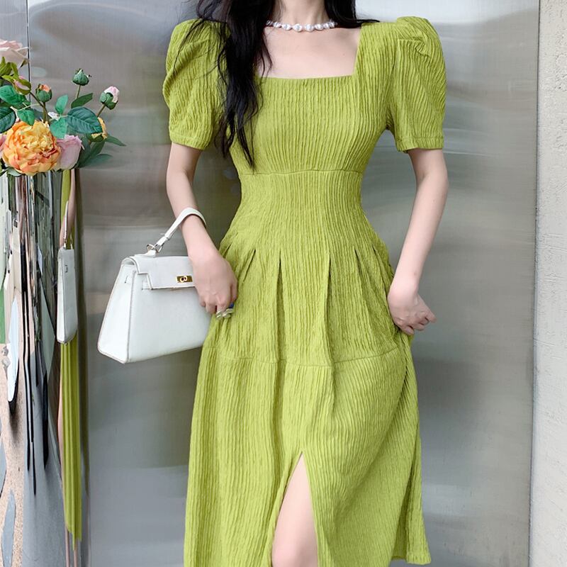スクエアネック ミモレ丈 半袖 ワンピース ワンピドレス 膝下 ミモレ 袖あり 半袖 パフスリーブ 襟なし スリム 細身 Aライン 切り替えデザイン プリーツ スリット ポケット ハイウエスト かわいい 大人可愛い きれいめ シンプル 大人 上品 おしゃれ レトロ 大人女子 主役級 無地 夏 10代 20代 レディース 通勤 学生 通学 デート お出かけ 女子会 休日 イベント 旅行 着回し 普段使い 重ね着 韓国 韓国系 オルチャン 美脚 脚長 サイズ S M 色展開 緑 グリーン 黄色 イエロー