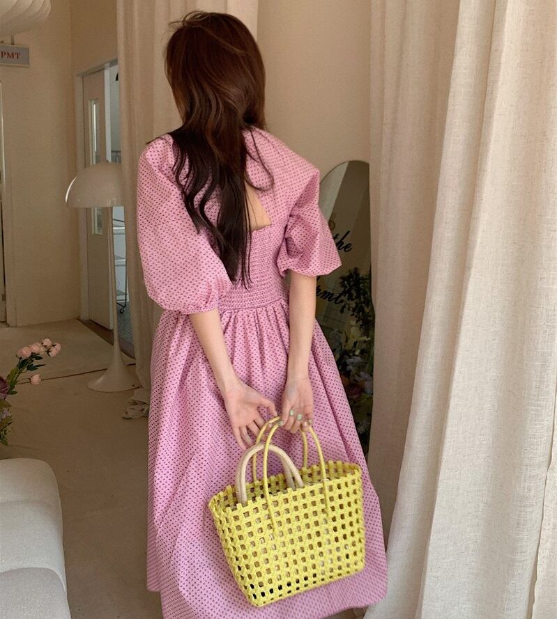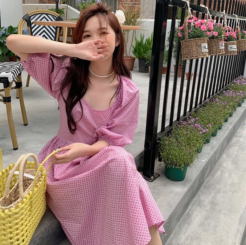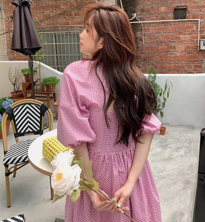 背中開き パフスリーブ ミモレ丈 ワンピース フレアワンピース ワンピドレス 膝下 ミモレ 袖あり 半袖 ボリューム袖 スクエアネック 襟なし フレア Aライン 切り替えデザイン ハイウエスト かわいい 大人可愛い カジュアル 大人 おしゃれ お洒落 大人女子 ラブリー キュート ガーリー 主役級 存在感 柄 ドット柄 水玉 春 夏 10代 20代 レディース 通勤 学生 通学 デート お出かけ 女子会 休日 旅行 着回し 普段使い 韓国 韓国系 オルチャン 楽ちん サイズ S M ピンク