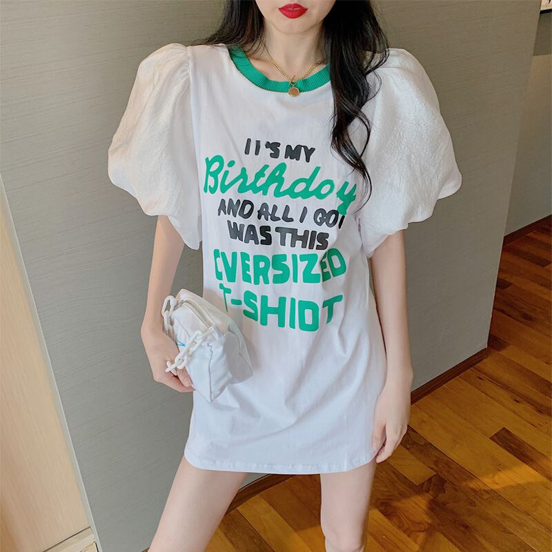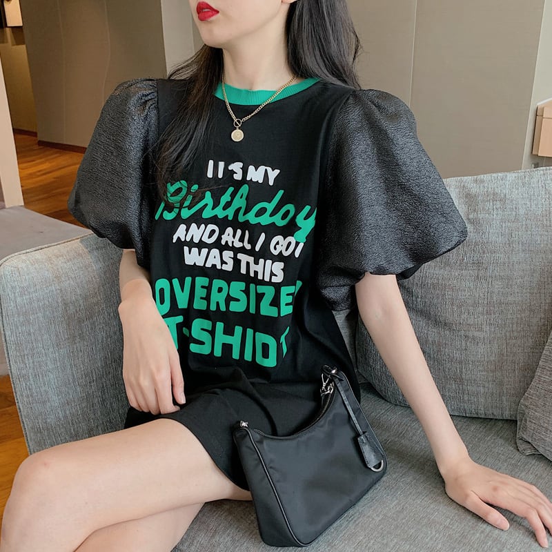 異素材MIX パフスリーブ 半袖 Tシャツ トップス チュニック ミディアム丈 袖あり ボリューム袖 ラウンドネック 襟なし かわいい 大人可愛い カジュアル 大人 おしゃれ お洒落 大人女子 ルーズ 個性的 存在感 英字 柄 プリント ロゴ 春 夏 10代 20代 レディース 通勤 学生 通学 デート お出かけ 女子会 休日 旅行 着回し 普段使い 韓国 韓国系 オルチャン ゆったり ゆる フリーサイズ 色展開 白 ホワイト 黒 ブラック