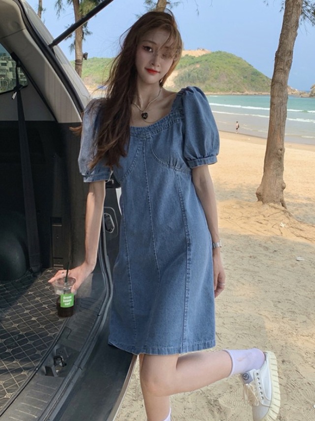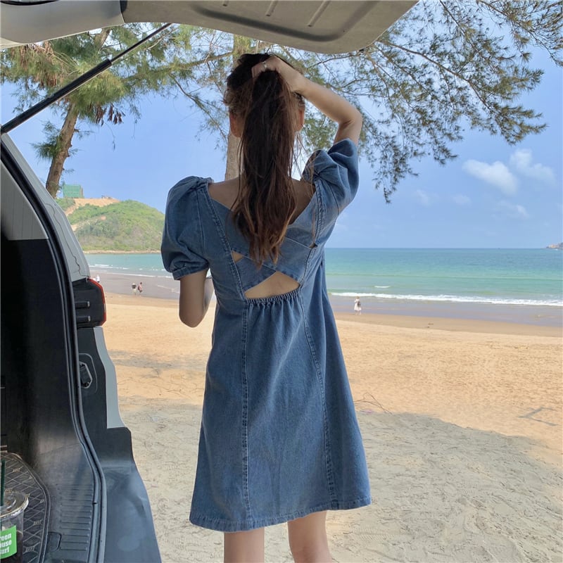 背中開き ミニ丈 デニムワンピース ワンピース ミニ 膝上 袖あり 半袖 パフスリーブ スクエアネック 襟なし Aライン 切り替えデザイン デニム ブルーデニム かわいい 大人可愛い シンプル カジュアル 大人 おしゃれ お洒落 大人女子 無地 春 夏 10代 20代 レディース 通勤 学生 通学 デート お出かけ 女子会 休日 旅行 着回し 普段使い 重ね着 韓国 韓国系 オルチャン 楽ちん サイズ S M L XL 青 ブルー