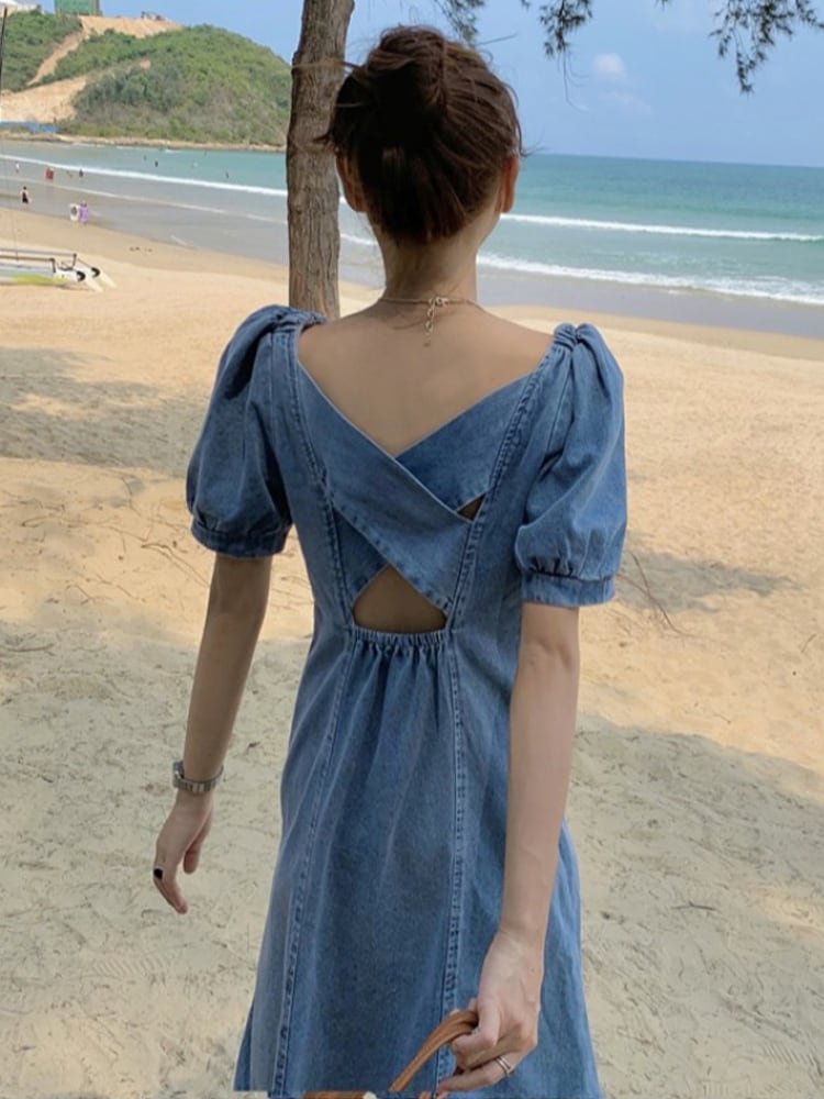 夏らしい背中開きのデニムワンピース。