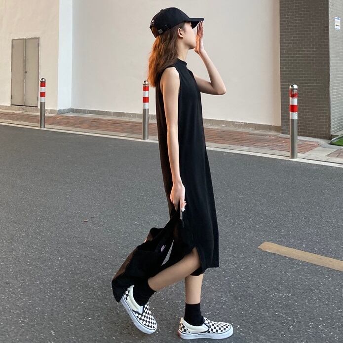ノースリーブ ミモレ丈 ワンピース 膝下 ミモレ 袖なし 襟付き スタンドカラー Iライン スリット サイドスリット 綿 かわいい 大人可愛い シンプル カジュアル 大人 おしゃれ お洒落 大人女子 ルーズ 無地 夏 10代 20代 レディース 通勤 学生 通学 デート お出かけ 女子会 休日 旅行 着回し 普段使い 重ね着 韓国 韓国系 オルチャン 楽ちん 体系カバー ゆったり フリーサイズ 色展開 黒 ブラック 灰色 ダークグレー