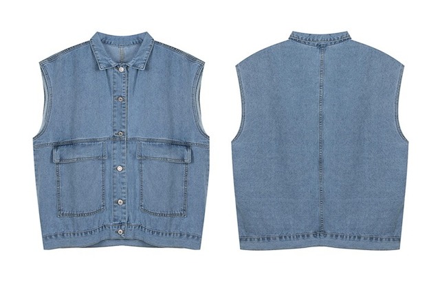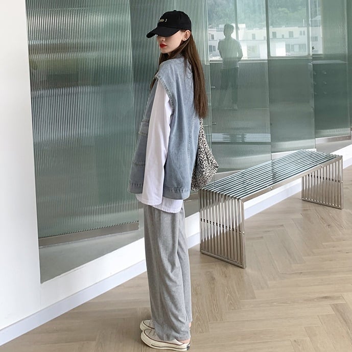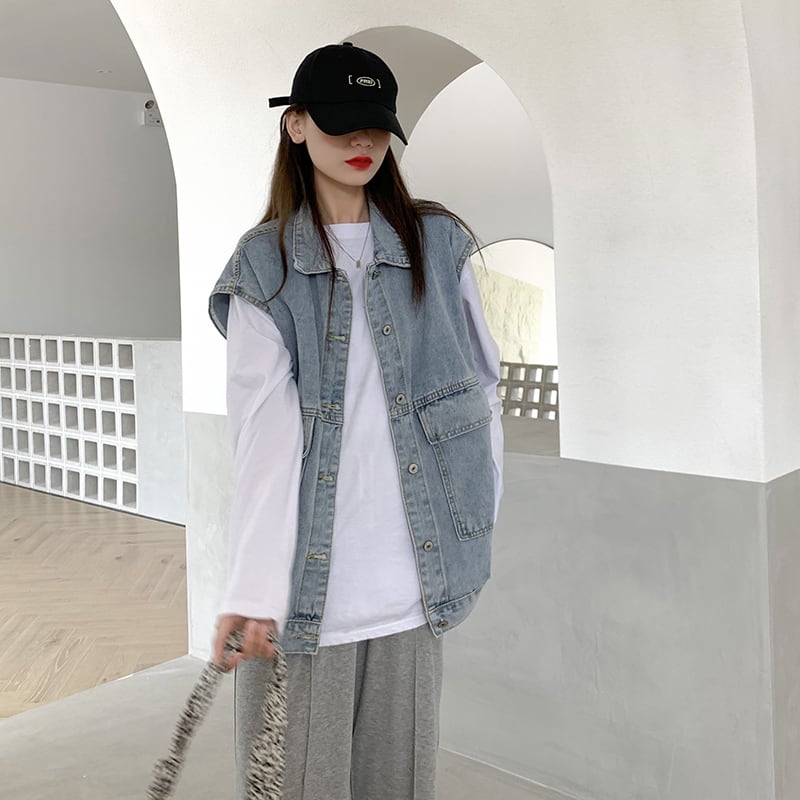 大きいサイズ セットアップ ロンT デニム ベスト 2点セット トップス アウター Tシャツ ミディアム丈 袖なし ノースリーブ 長袖 ラウンドネック 襟付き 前開き ブルーデニム ツーピース シンプル カジュアル 大人 おしゃれ お洒落 かっこいい こなれ感 メンズライク ボーイッシュ 無地 春 夏 秋 10代 20代 レディース 通勤 学生 通学 デート お出かけ 休日 旅行 着回し 重ね着 韓国 ゆったり サイズ S M L XL 2XL 3XL 色展開 白 ホワイト 黒 ブラック 青 ブルー
