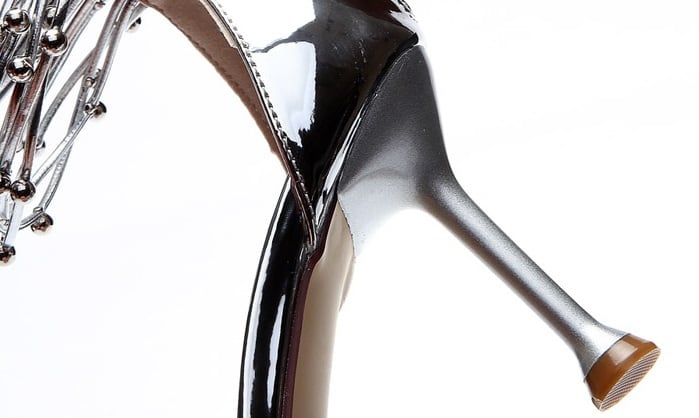 金銀に輝き足首のラインストーンで足元をキレイ見せしてくれるハイヒールサンダル。