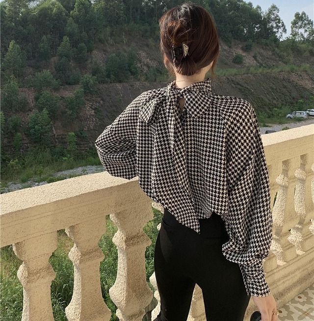 千鳥格子柄 フロントリボン シャツ ブラウス トップス ミディアム丈 袖あり 長袖 ボリューム袖 パフスリーブ 襟付き リボン かわいい 大人可愛い きれいめ シンプル カジュアル 大人 上品 おしゃれ お洒落 大人女子 個性的 主役級 存在感 柄 格子柄 千鳥格子 春 秋 10代 20代 レディース 通勤 学生 通学 デート お出かけ 女子会 休日 旅行 着回し 普段使い 重ね着 韓国 韓国系 オルチャン ゆったり サイズ S M 千鳥格子
