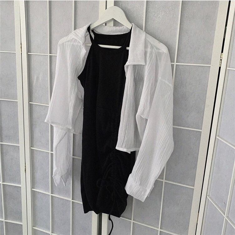 シャーリングを効かせた、シンプルなミニ丈キャミワンピ。