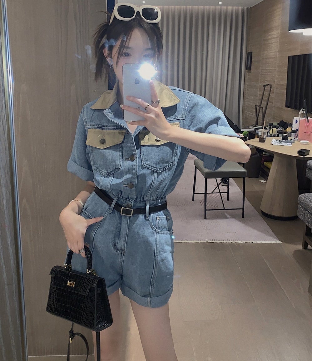 ベルト付き ショート丈 デニム オールインワン パンツ ボトムス ズボン ショートパンツ ショート 袖あり 半袖 襟付き スリム 細身 ワイド ベルト ウエストマーク ポケット ハイウエスト ブルーデニム かわいい 大人可愛い シンプル カジュアル 大人 おしゃれ お洒落 大人女子 こなれ感 無地 夏 10代 20代 レディース 通勤 学生 通学 デート お出かけ 女子会 休日 旅行 着回し 普段使い 重ね着 韓国 韓国系 オルチャン 楽ちん 脚長 サイズ S M L 色展開 青 ブルー