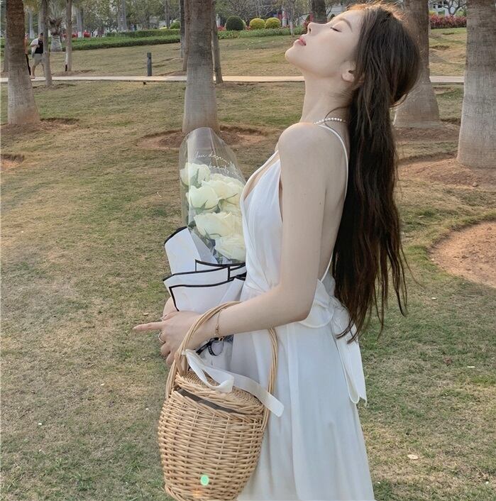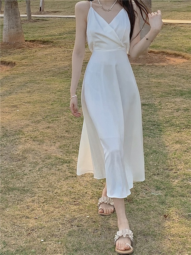 バックリボン Vネック キャミソール ワンピース ワンピドレス 膝下 ミモレ ミモレ丈 袖なし ノースリーブ カシュクール スリム Aライン 切り替えデザイン リボン バックコンシャス ファスナー ハイウエスト かわいい 大人可愛い きれいめ シンプル カジュアル 大人 上品 おしゃれ お洒落 大人女子 主役級 無地 夏 10代 20代 レディース 通勤 学生 通学 デート お出かけ 女子会 休日 パーティー イベント リゾート 旅行 着回し 普段使い 重ね着 韓国 サイズ S M L 白 ホワイト